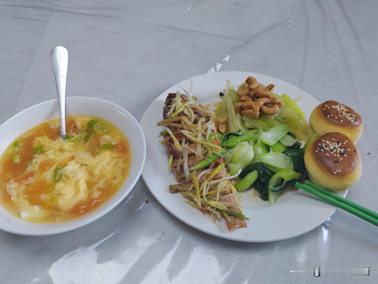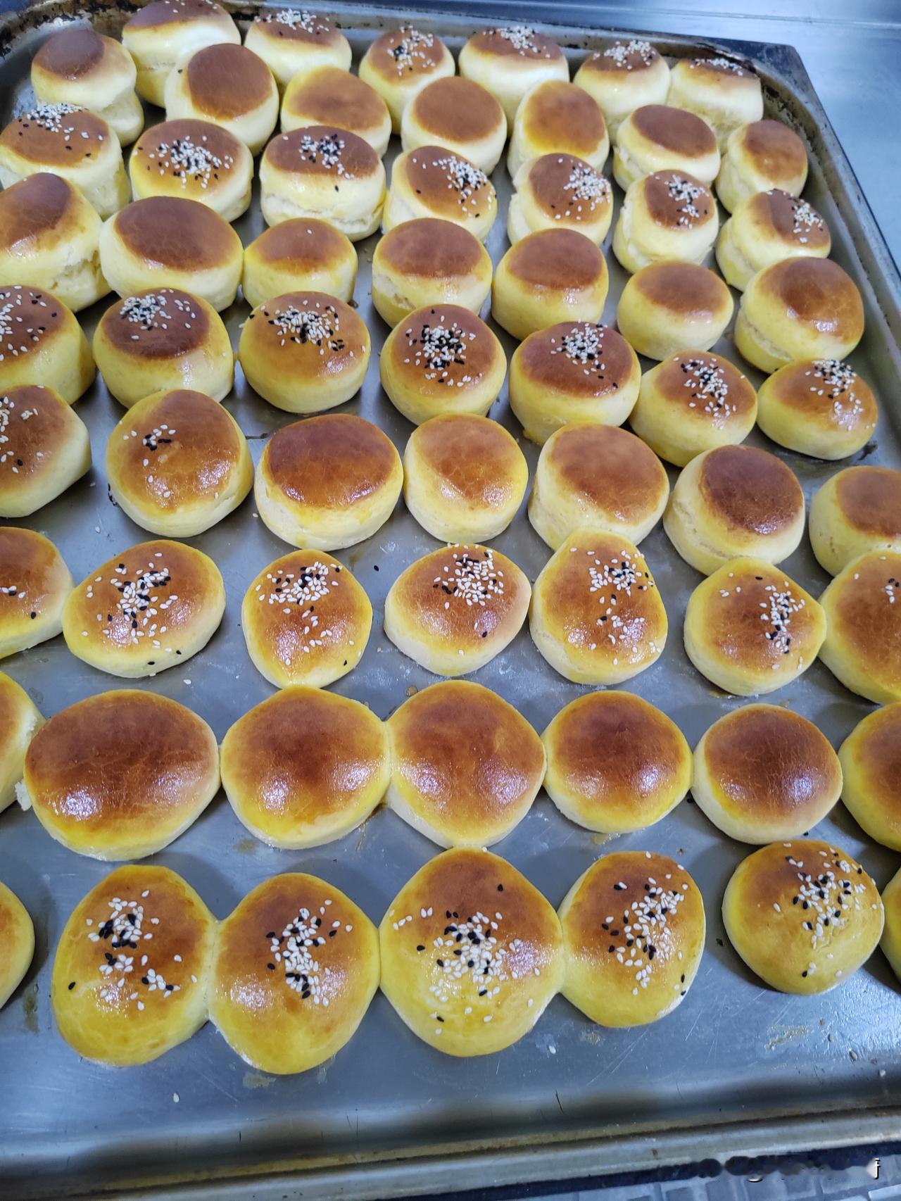 来第三个卸货港——北海道,已经三天了。总共一个船舱的货,到现在也还没有卸完,昨天元旦全天没有卸货,今天到现在为止,总共卸了两个小时,原计划是今天下午6点完货,明天早上开航,看来这计划又要往后推了。 今天吃午餐的时候,有一个哥们说,大厨,今天的甜点真好吃,是用南瓜做的吗?我说这不是南瓜啊!全部用鸡蛋和油和的面,没加一滴水,在我们那里叫做喜饼,这个饼本来是用电饼铛烙的,咱们船上没有电饼铛,我就用烤箱烤了,吃着很好吃,有点面包的口感,还有蛋糕的香味,休假的时候我在家里也做过两次,都可以当零食吃的。 今天就把做法分享给大家: 1 准备一个小盆,打入500克蛋液,100克白糖,9克酵母粉,80克花生油,搅拌均匀。 2 把搅拌均匀的蛋液,倒入900克高筋粉中,和成偏软的面团,放在温暖的地方发酵至2倍大。 3 揉面排气,分成大小均匀的剂子,再擀成1-1.5厘米的厚度,二次醒发,发酵好了再烤。烤箱要提前预热,上下温180℃烤10分钟,再调到200℃烤5-8分钟即可。 (图二是今天的午餐)