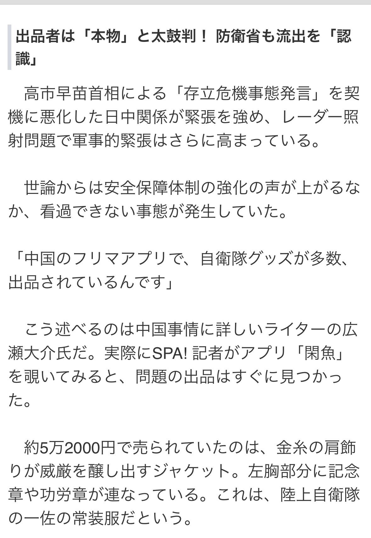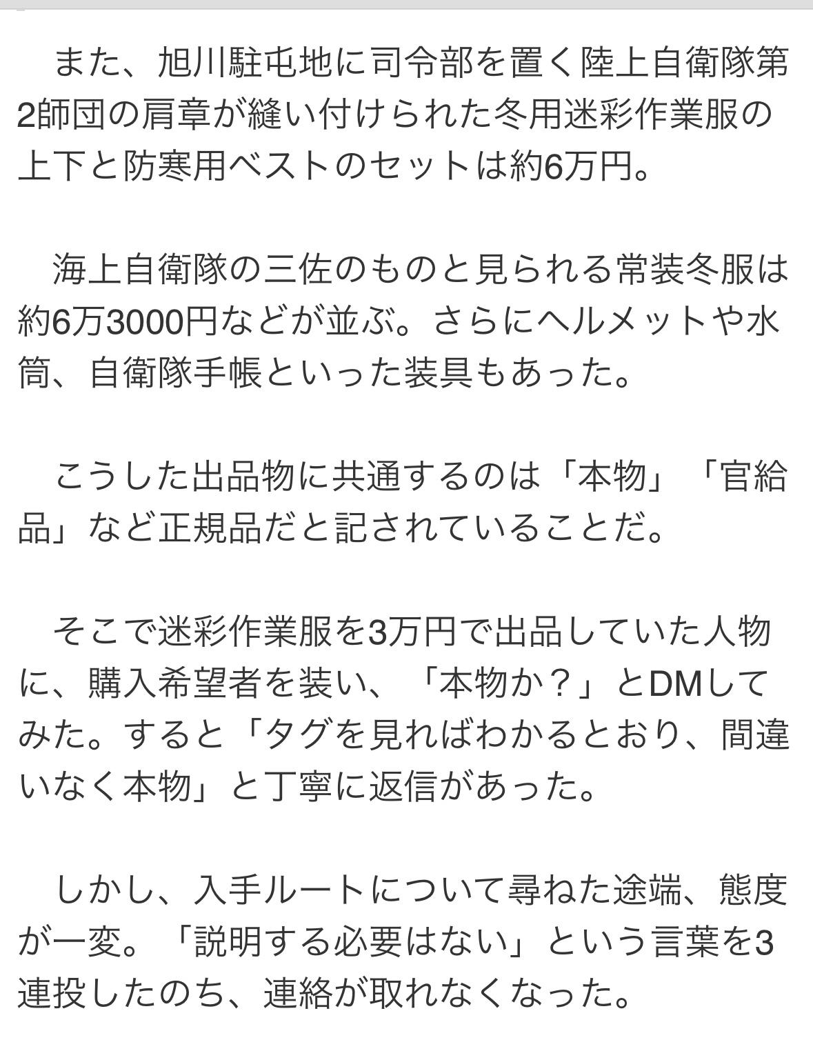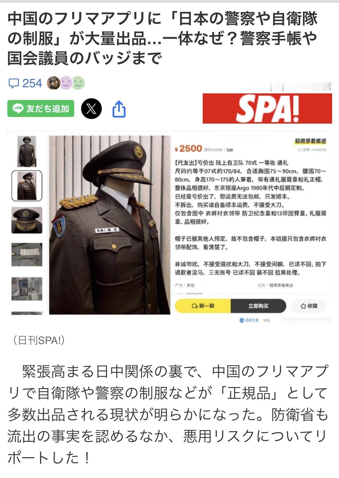 《闲魚》上有日本陆上自卫队中校制服,售价约为5.2万日元,配有庄重的金色肩章,左胸佩戴着一排纪念勋章和功勋章。 还有一套冬季迷彩工作服和一件防寒背心,肩章是日本陆上自卫队第二师团的标志,该师团总部设在旭川营地,售价约为6万日元。 一套海上自卫队中校的常规冬季制服也在展出,售价约为6.3万日元。此外还有头盔、水壶和自卫队笔记本等装备。 所有物品的共同点是都标注为“正品”、"原装”、"政府配发”。