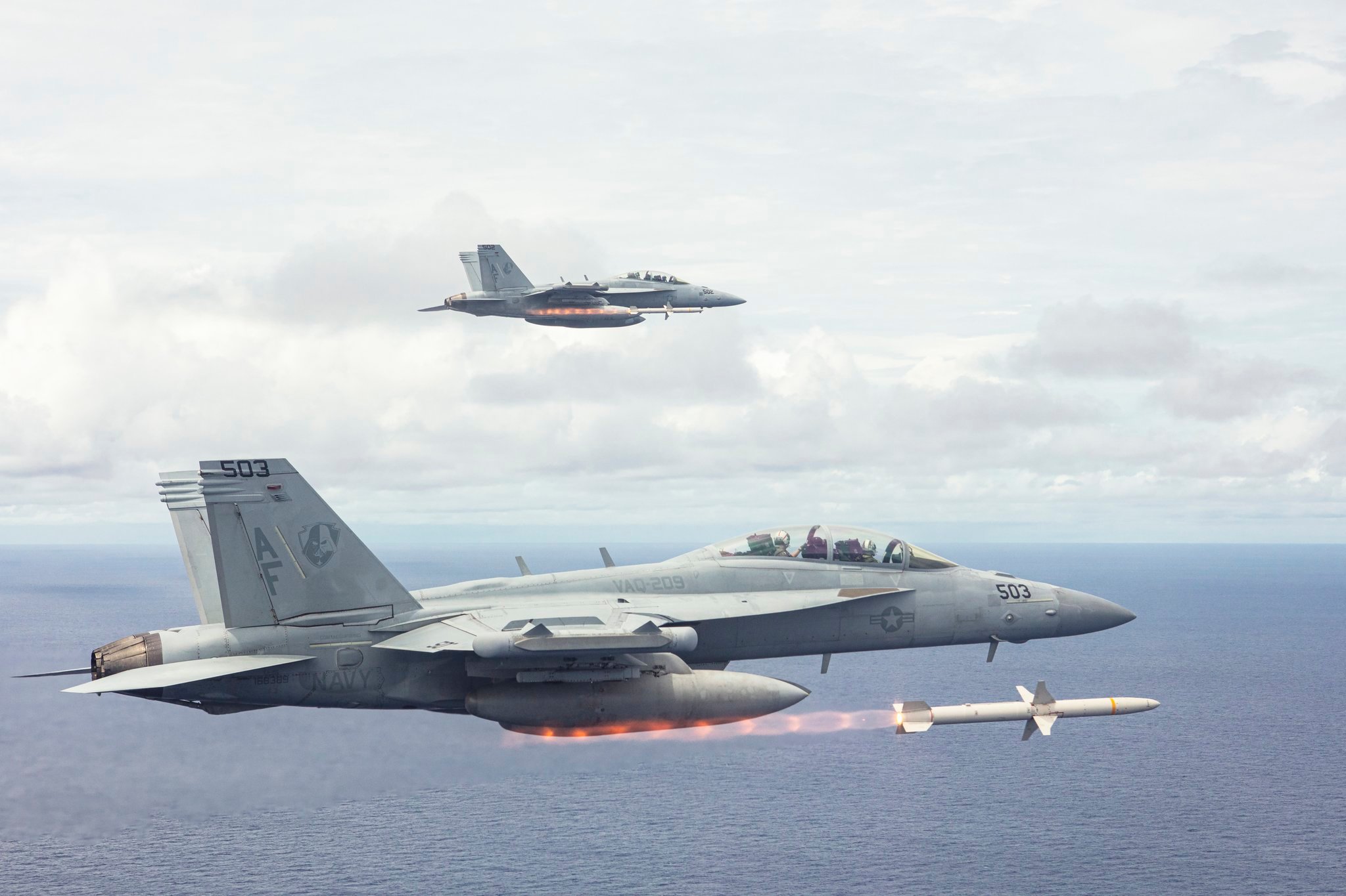 2022年8月30日,2架隶属于美国空军第209电子攻击中队"星战武士"的EA-18G“咆哮者”电子战飞机,在马里亚纳群岛综合靶场(MIRC)上空进行实弹演习期间,同步发射两枚AGM-88“哈姆”高速反辐射导弹摄影:Peter Scheu
