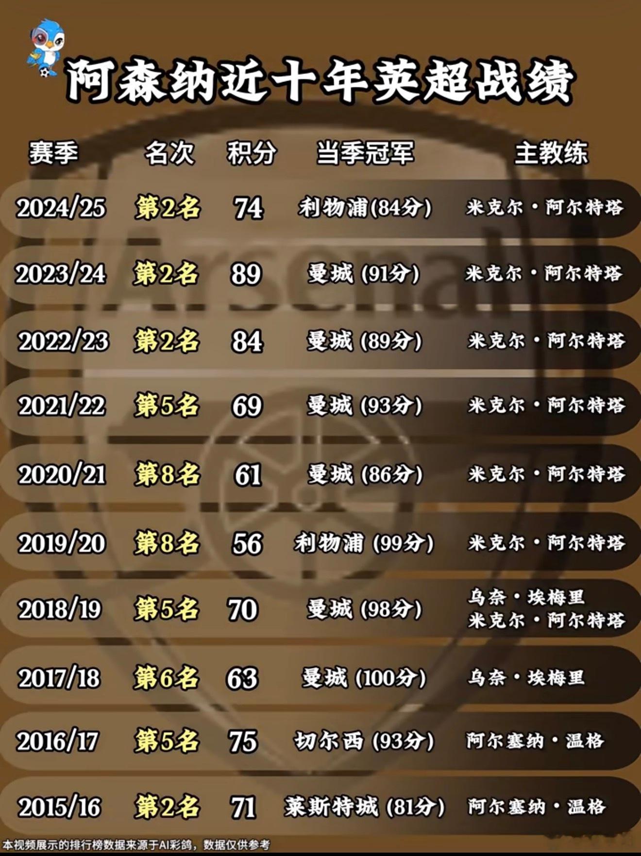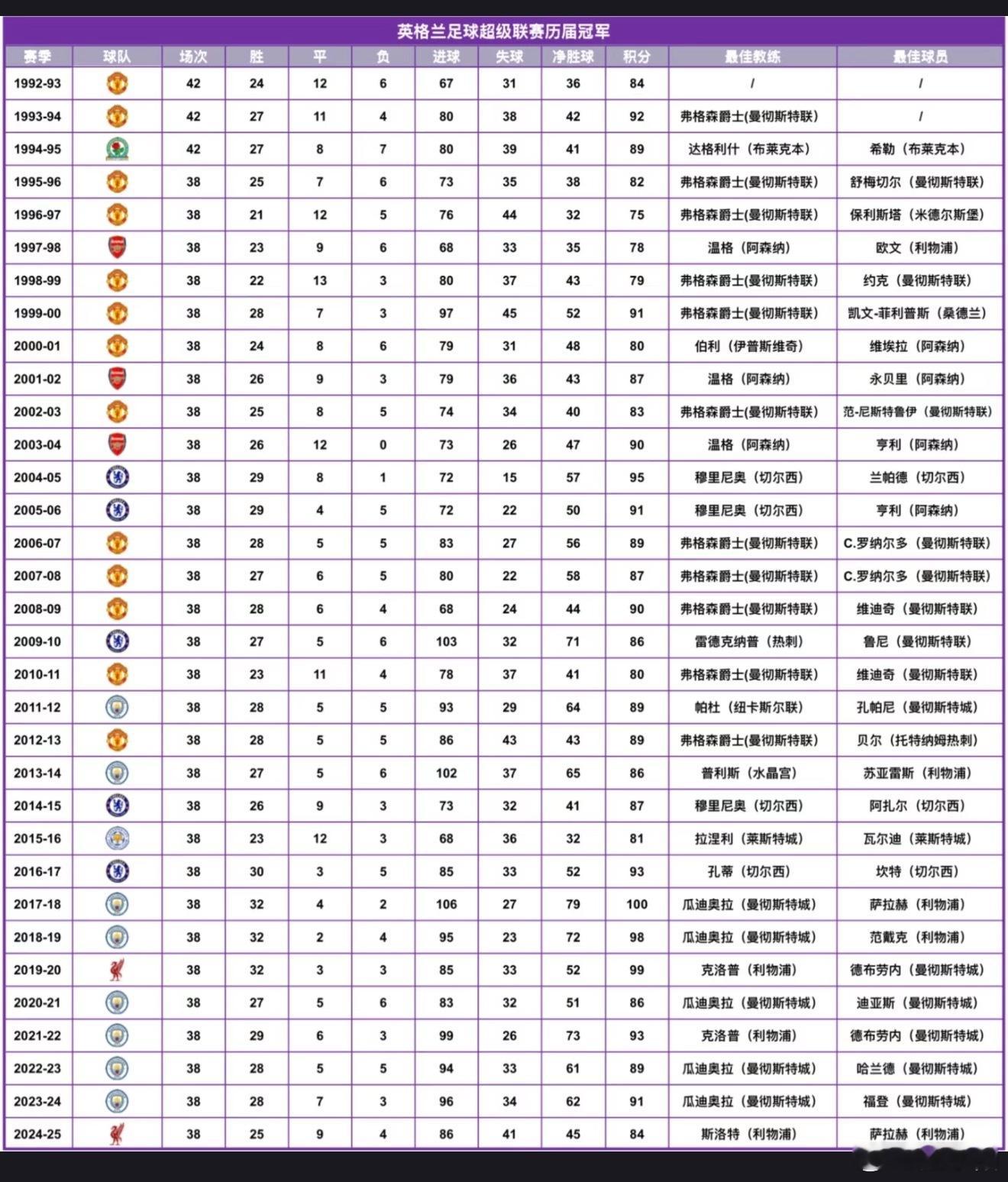 英超的半程已经结束,曼城果然被桑德兰逼平,半程冠军阿森纳的领先优势扩大到 4 分。图四是阿森纳近 10 年英超名次、积分以及与冠军的分差。本赛季半程打完阿森纳是拿到 45 分,保持现在这个势头的话,确实有很大希望在这个赛季把窗户纸捅破。图五是详细的英超历届冠军详细积分榜,阿森纳上一次联赛夺冠,是遥远的 2003 到 04 赛季,到现在整个赛季保持不败这件事,仍然只有那个赛季的阿森纳做到过。本赛季阿森纳输球场次和失球数都是英超最少,而球队在进攻层面确实缺一个高效射手,这方面曼城有哈兰德,上个赛季的利物浦有萨拉赫。但总进球数方面,阿森纳全英超也只是仅比曼城少。英超