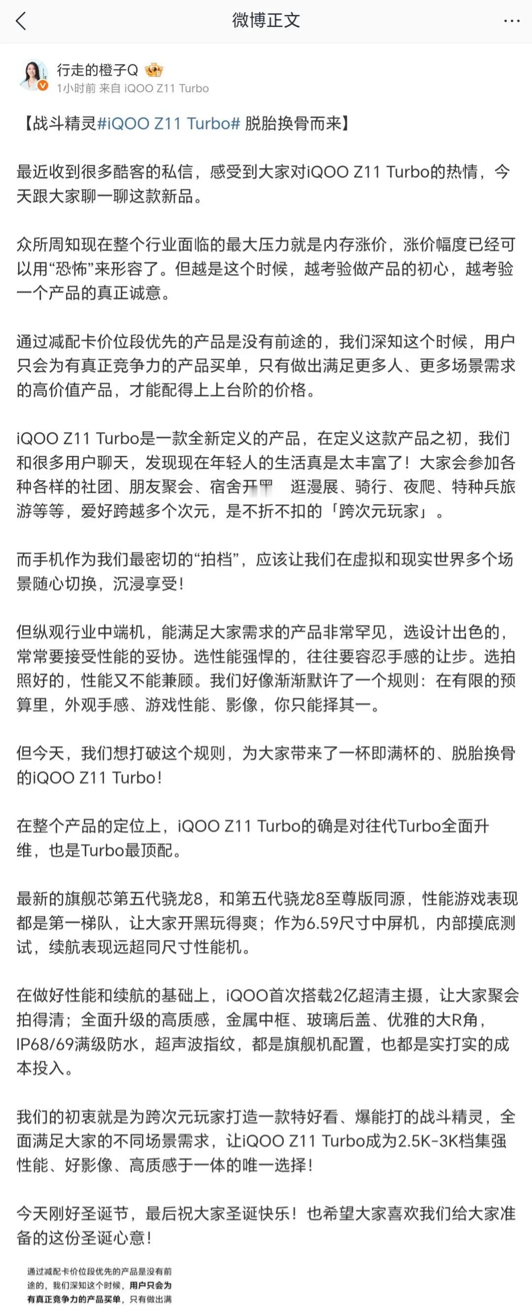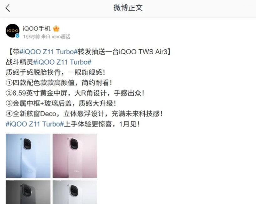 【iQOO Z11 Turbo新机亮相】iQOO 手机官方公布了 iQOO Z11 Turbo 四款配色的外观,包括沧浪浮光、光晕粉、极夜黑、天光白,新机将在1 月发布据介绍,iQOO Z11 Turbo 手机配备 6.59 英寸黄金中屏,并辅以大 R 角设计,宣称手感出众。新机还采用金属中框 + 玻璃后盖 + 全新舷窗 Deco 立体悬浮设计,整机质感得到升级。iQOO Z 系列产品经理邢程 12 月 25 日谈起了 iQOO Z11 Turbo 新机,她表示现在整个行业面临的最大压力就是内存涨价,涨价幅度已经可以用“恐怖”来形容,越是这个时候,越考验做产品的初心。据介绍,新机搭载最新的旗舰芯第五代骁龙 8,配备 6.59 英寸中屏。另外,iQOO Z11 Turbo 还 iQOO 首次搭载 2 亿超清主摄,并全面升级金属中框、玻璃后盖、优雅的大 R 角、IP68 / 69 满级防水、超声波指纹等。邢程称,通过减配卡价位段优先的产品是没有前途的,深知这个时候,用户只会为有真正竞争力的产品买单,只有做出满足更多人、更多场景需求的高价值产品,才能配得上上台阶的价格。iQOO Z11 Turbo 是一款全新定义的产品,是对往代 Turbo 全面升维,也是 Turbo 最顶配。