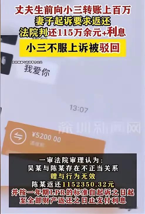 内蒙古赤峰,一男子突发急症死在了情人家中,出轨多年的秘密,直到男子死亡,妻子才发现。更让妻子愤怒的是,在给丈夫整理遗物时,她发现丈夫居然瞒着她给情人先后转了81.7万,除此之外,还陆续给情人网购了84万的东西。愤怒的妻子一纸诉状将丈夫的情人告上了法庭,以夫妻共有财产为由,要求该情人归还全部款项,赠与的84万网购产品折现归还,并且支付资产占用期间相应的利息,最终法院的判决大快人心。 女子刘某和死者吴某于2003年结婚,婚后的生活和很多夫妻一样,偶尔有拌嘴,但从未大吵大闹,很快就能和好如初,虽平淡,但刘某认为这和其他家庭也没什么区别。 然而突然的一通电话,让刘某发现了丈夫多年的秘密,愤怒不已。 2024年11月27日晚上,妻子刘某正在家整理家务,突然接到一个陌生女人的电话,打电话的女子是陈某。陈某说吴某在她家突发急症被送进了医院。 刘某听到丈夫被送到了医院,来不及多想,就火急火燎了奔向了医院。到院后见到了打电话的陈某,刘某发现女子陈某有些不自然,然后还没来得及跟丈夫说上一句话,吴某就因抢救无效死亡。人死不能复生,悲伤的刘某给丈夫办了丧事。 然而在给丈夫吴某整理遗物的时候,刘某却在吴某的手机上发现了一个天大的秘密,吴某的手机中,赫然显示丈夫吴某和女子陈某竟然保持了5年的不正当关系,聊天内容十分暧昧,就像是一对夫妻似的。而在两人交往的5年中,吴某居然先后给情人陈某转了81.7万,除此之外,还陆续通过网购,给陈某买了84万的东西,收件人都是陈某。 愤怒的刘某迅速找到了陈某,对其质问。而陈某则满口否认两人的关系,谎称这些钱是俩人合伙做生意用的。 拿到了证据的刘某怎会相信陈某的谎话,在一分钱也没有要回来的情况下,一直诉状将陈某告上了法庭,以这是夫妻共有财产为由,丈夫吴某和陈某存在多年不正当关系,在未告知自己的情况下,将夫妻共有财产赠与情人,属于违法行为。要求陈某归还81.7万,以及网购的84万折现归还,并且还有支付这些财产占用期间的利息。 法庭上,陈某狡辩说这笔钱是两人合伙做买卖用的,不是只有吴某给她有转账,自己也给吴某有51万的转账,并且表示这84万的网购,虽然收件人是自己,但都是吴某自己买给了他自己。 法院取证后,了解到吴某先后给陈某转账81.7万,而陈某则给吴某也有51万的转账,但让陈某出示俩人合伙做生意的证据时,陈某却什么也拿不出,并且通过俩人几年的聊天内容,内容露骨暧昧,足以证明俩人有多年不正当关系,并且吴某给陈某网购的84万东西,没有一件男人用的,全部是黄金首饰,女性用的名牌包包。 最终一审法院,吴某擅自挪用夫妻共有财产赠与情人,超出合理范畴,要求陈某归还刘某31.7万的转账,以及往后的84万礼物折现归还,并且支付相应的利息。 收到判决后的陈某不服,遂提起上诉,最终也被二审法院驳回,维持了原判。 出轨像一面镜子,映射出关系中隐藏的裂痕与人性的脆弱。它提醒我们:爱不仅仅是感觉,更是一种需要敬畏和守护的责任。 随后也提醒某些女性不要知三当三,因为这是非常可耻的! 婚内丈夫出轨 婚内致死案