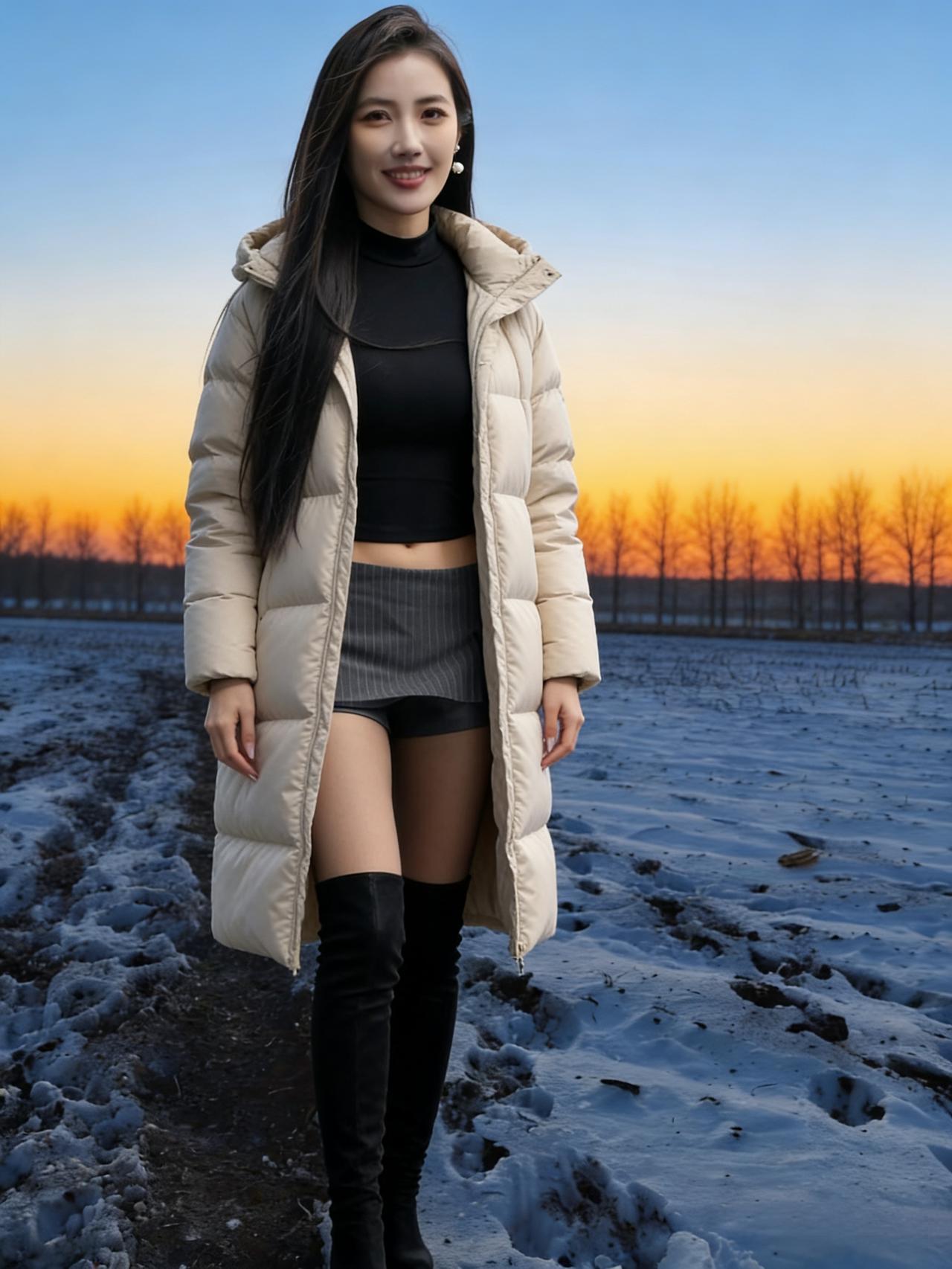 琼英漫舞覆荒榛,松柏凝霜色更匀。 素袂轻扬承冷絮,长发垂肩映雪垠。 眸含清浅千山