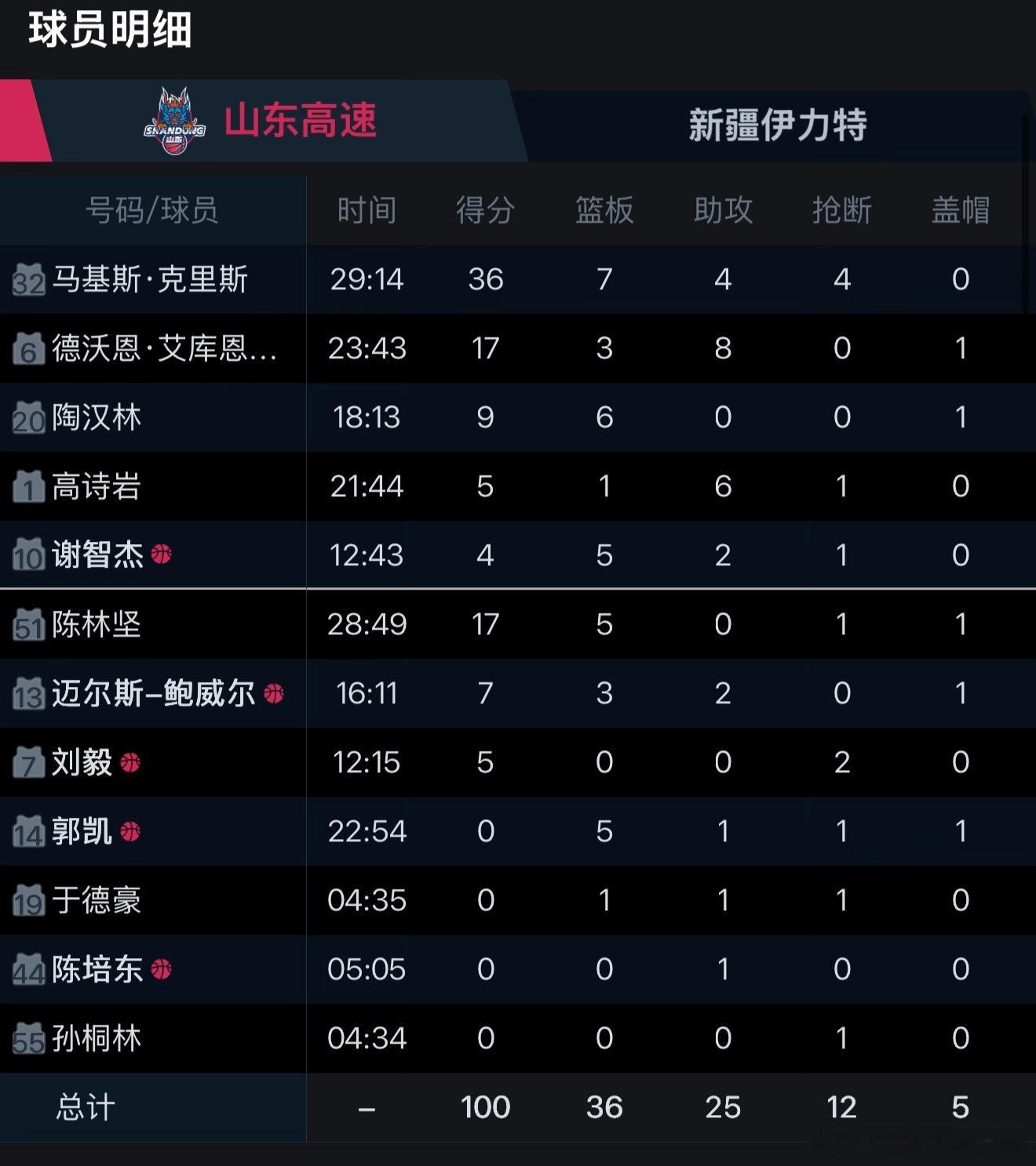 山东高速100:85大胜新疆伊力特!送给对方连败!本场比赛山东防守端强硬,进攻端犀利,第一节就打出了28:9,之后山东队持续高强度比赛,克里斯不断杀伤内线,珀塞尔、陈林坚投射精准,也抵挡住了新疆第三节的反扑,成功拿下比赛!数据方面:克里斯36分7篮板4助攻4抢断,珀塞尔17分8助攻,陈林坚17分5篮板,陶汉林9分6篮板,鲍威尔7分