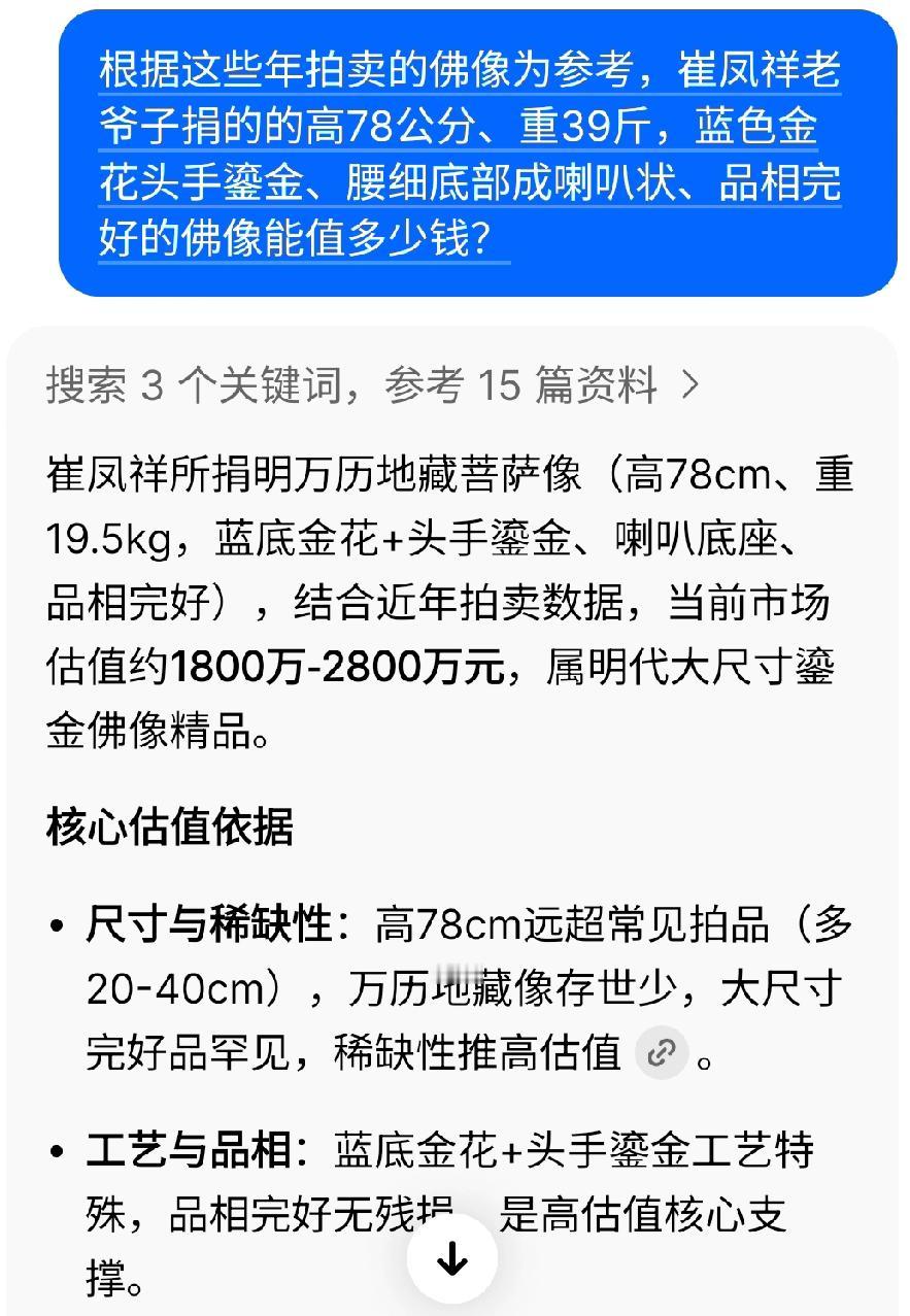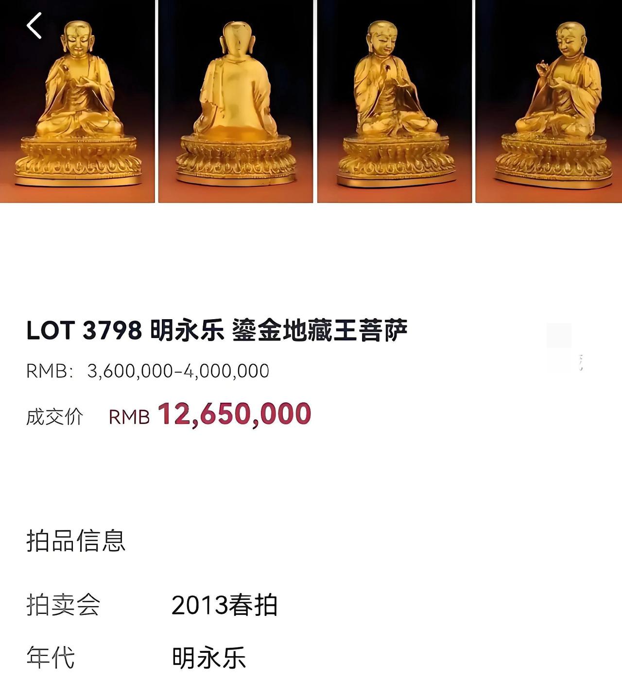 崔老爷子捐赠的明代佛像离奇失踪, 能被惦记的东西肯定价值不菲, 那这件失踪的佛像到底能值多少钱呢,今天我们就来探讨一下: 2006年,一尊高72.5cm的明代永乐鎏金铜释迦摩尼坐像,在香港苏富比秋季拍卖会上以1.166亿元港元成交。 2013年,一尊高21.5cm的铜鎏金民代永乐地藏王坐像,是一千两百六十五万成交的。 2024年,一尊高37.5cm的清代乾隆年间的地藏王佛像,是以四百四十九万成交的。 2025年,一尊15.5cm的明代鎏金文殊菩萨像,是以六百二十一万成交的。 佛像成交的金额,根据年份、尺寸、材质、品类、存世量、保存度、交易时间等都会不一样,但根据这些年成交的明代鎏金佛像记录,最低的也有300多万。 催老爷子的这个是明代万历年间的地藏王佛,高七十八公分,重三十九斤,蓝色金花头手鎏金,腰细底下呈喇叭状,且品相保存完好。 我用豆包估了下价,给出的价格在1800到2800万之间,这价格怪不得会惦记上。 你们觉得崔老爷子的这件明代佛像能值多少钱,欢迎来评论区留下你的答案~