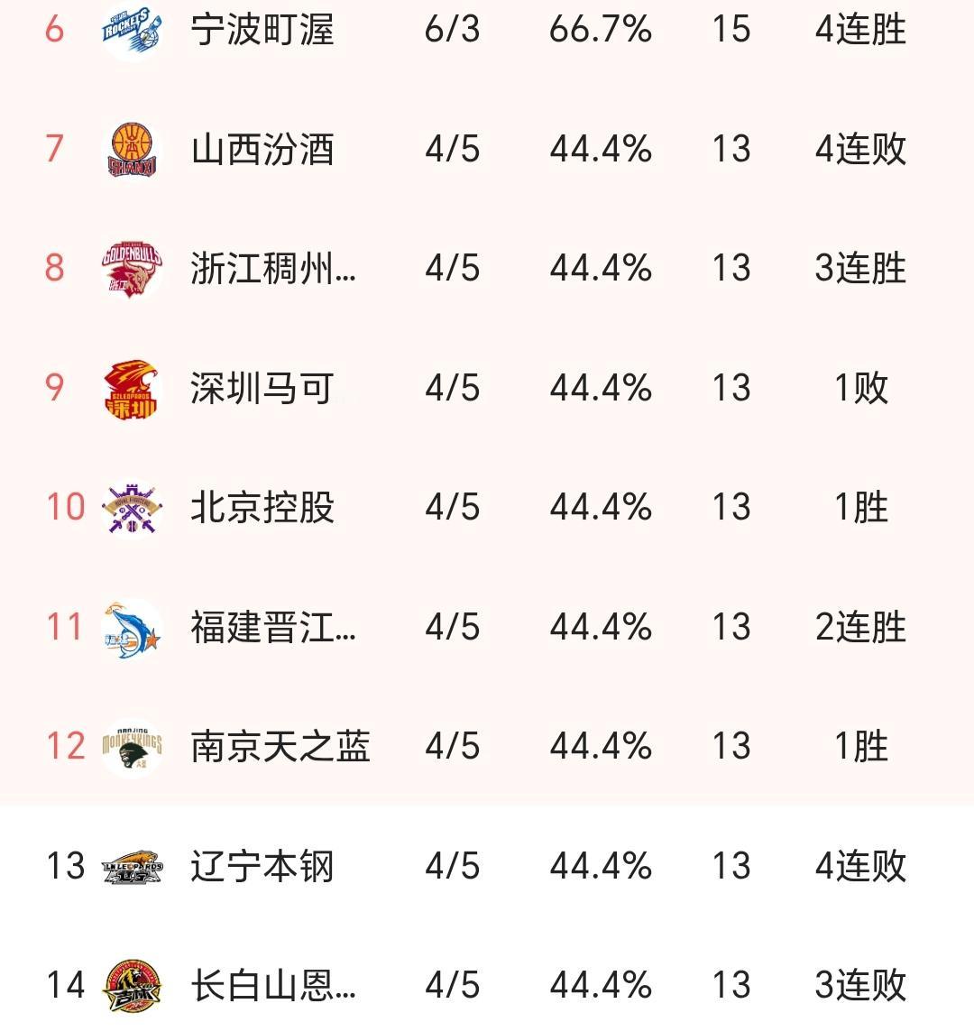CBA第九轮战罢,一看积分榜,辽宁和山西这个哥俩还挺好的,够哥们儿,都是四连败,手挽手4胜5负。 两个上赛季四强球队,现在都来到季后赛边缘位置。接下来,咱们看一看这哥俩谁先走出泥潭吧!