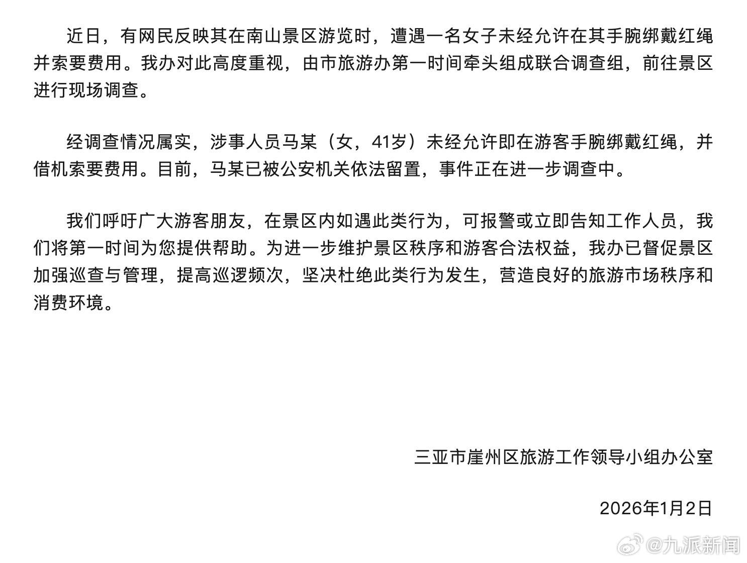#女子给游客绑红绳索费用被留置#【#官方通报一女子给游客绑红绳索费用#:已被公安机关依法留置,事件正在进一步调查中】1月2日,三亚市崖州区旅游工作领导小组办公室通报:近日,有网民反映其在南山景区游览时,遭遇一名女子未经允许在其手腕绑戴红绳并索要费用。我办对此高度重视,由市旅游办第一时间牵头组成联合调查组,前往景区进行现场调查。经调查情况属实,涉事人员马某(女,41岁)未经允许即在游客手腕绑戴红绳,并借机索要费用。目前,马某已被公安机关依法留置,事件正在进一步调查中。我们呼吁广大游客朋友,在景区内如遇此类行为,可报警或立即告知工作人员,我们将第一时间为您提供帮助。为进一步维护景区秩序和游客合法权益,我办已督促景区加强巡查与管理,提高巡逻频次,坚决杜绝此类行为发生,营造良好的旅游市场秩序和消费环境。