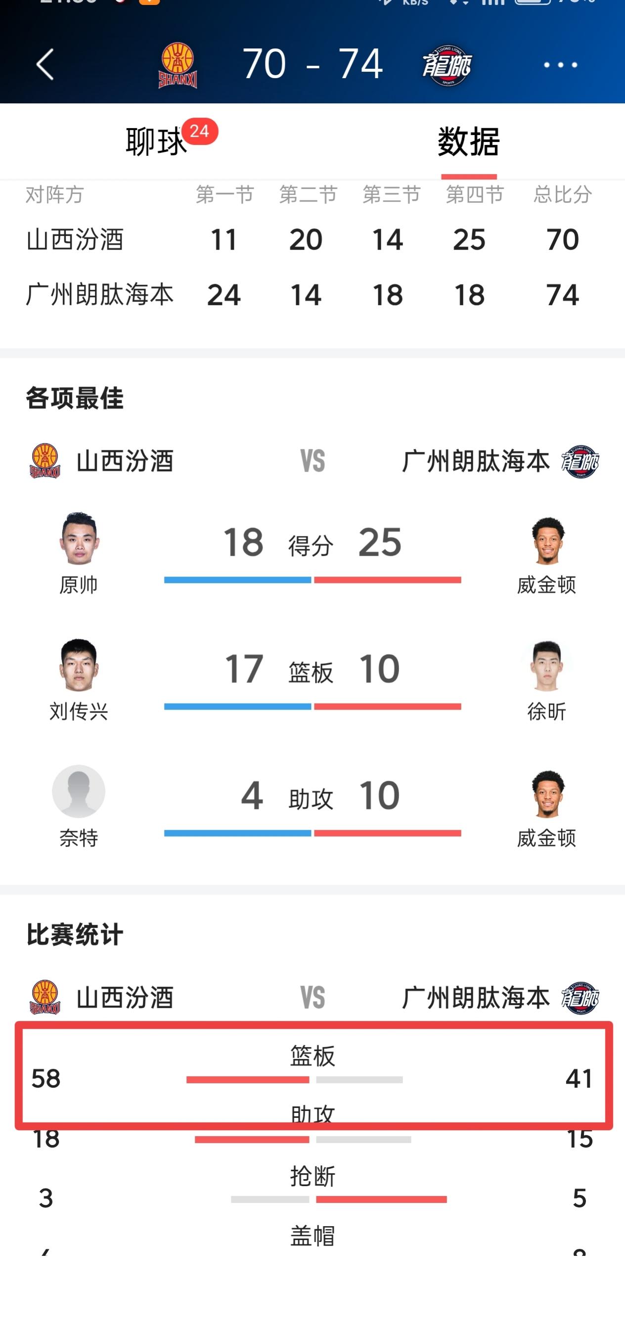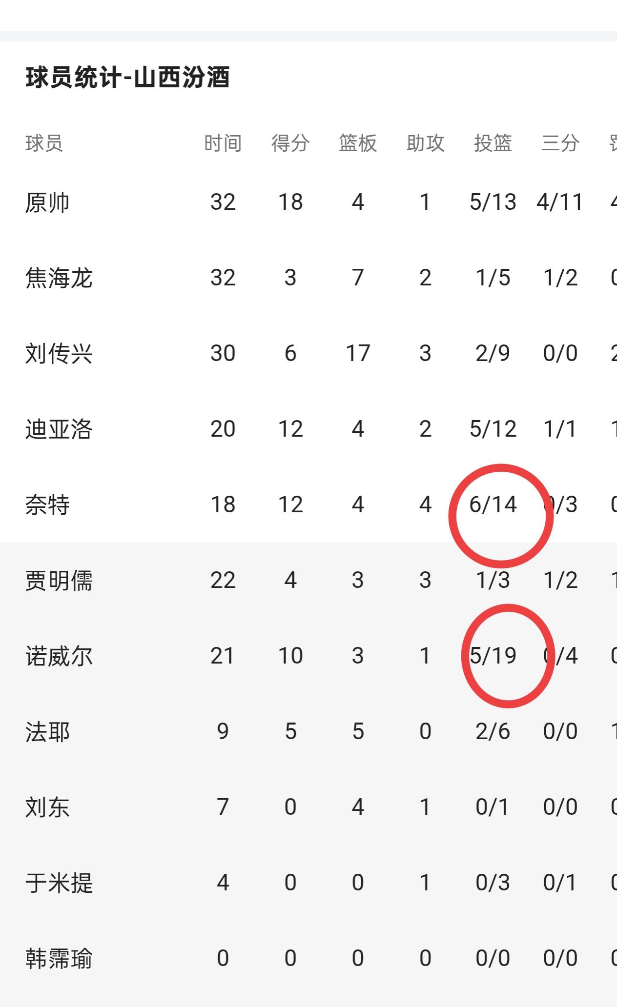 74:70!广州队少了17个篮板,居然还赢球了! 山西队三外援共45投16中,共得34分,换的外援也是水货?是汾酒喝多了么?几连败了?连卖光了主力球员的广州队都打不过,喊夺冠?靠敌牙落肘击么? 我猜,是汾酒没喝够!