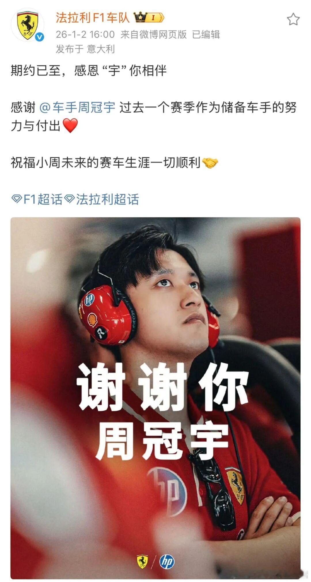 终于是官宣了,小周呀,谢谢你周冠宇F1倨能聊法拉利F1车队发文告别周冠宇