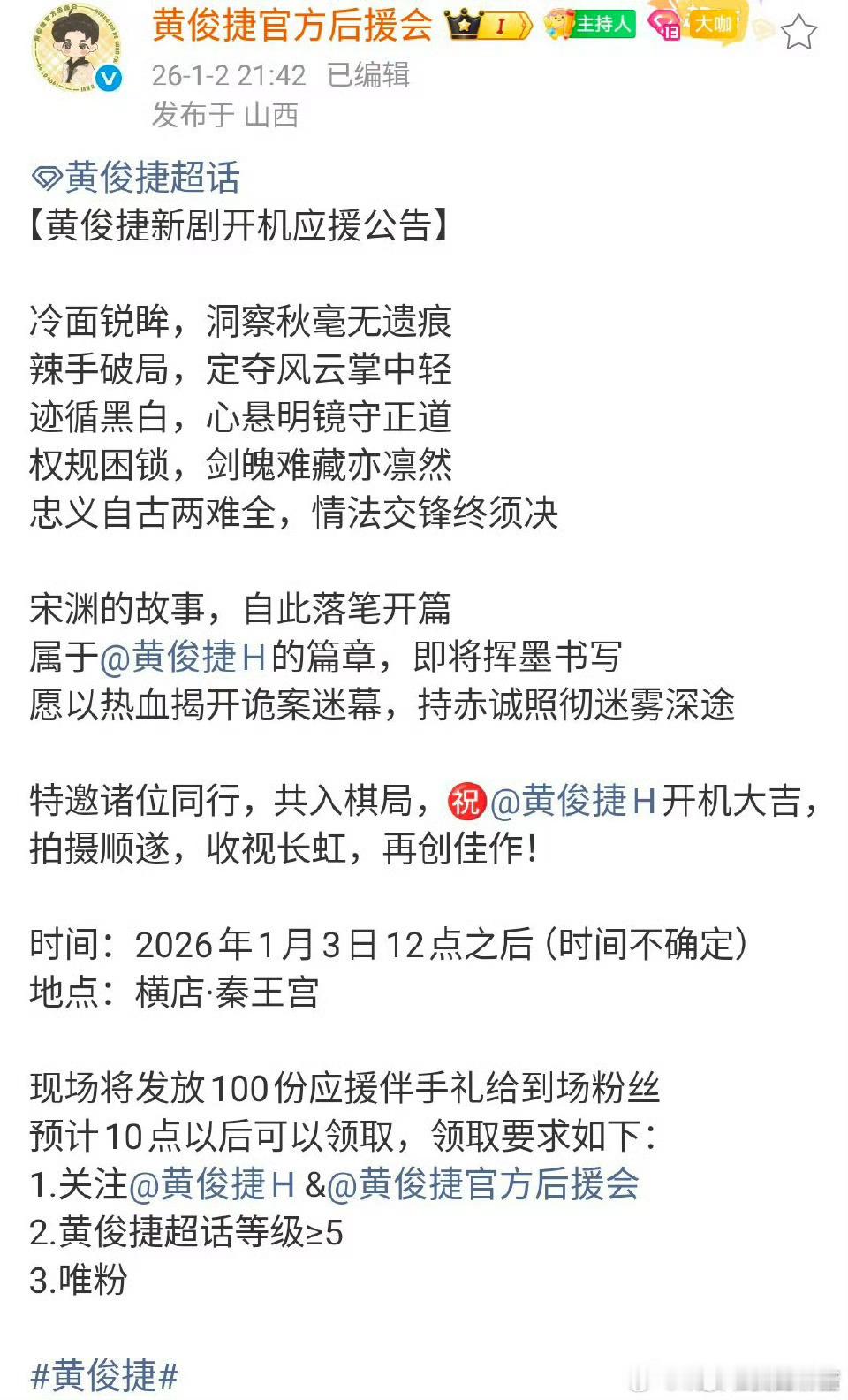 黄俊捷新剧大宋奇闻录明日开机,还准备了逆应援给粉丝,真的是好贴心的小黄同学