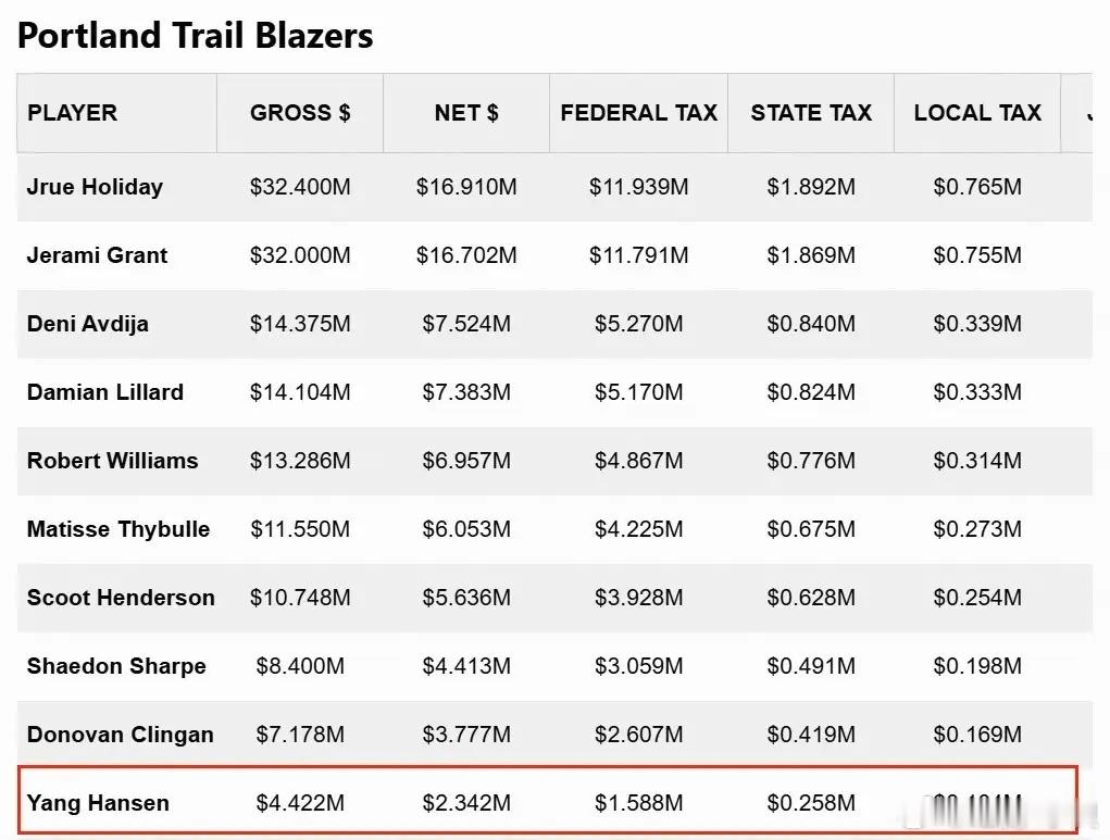杨瀚森新秀赛季工资:交税208万美元,税后工资234.2万美元杨瀚森在2025年NBA选秀大会首轮第16顺位被选中,与开拓者签下一份4年2139万美元的新秀合同,4年的薪资分别为442万美元、464万美元、486万美元、746万美元,其中,最后两年为球队选项,球队可以选择执行合同或不执行合同。2025-26赛季为杨瀚森的新秀赛季,本赛季合同薪资为442.236万美元,据统计,杨瀚森需要交158.8万的美国联邦政府税、25.8万的州税、10.4万的地方政府税、1.7万的运动员税及个人养老保险扣除等,最终到手工资约为234.2万美元。nba开拓者杨瀚森