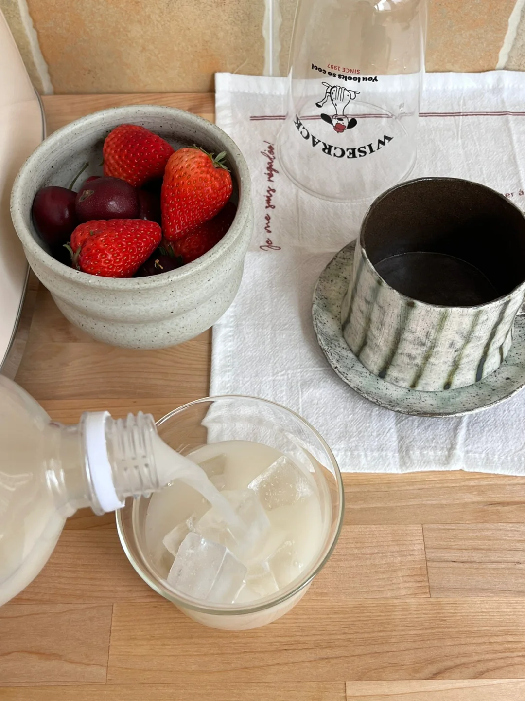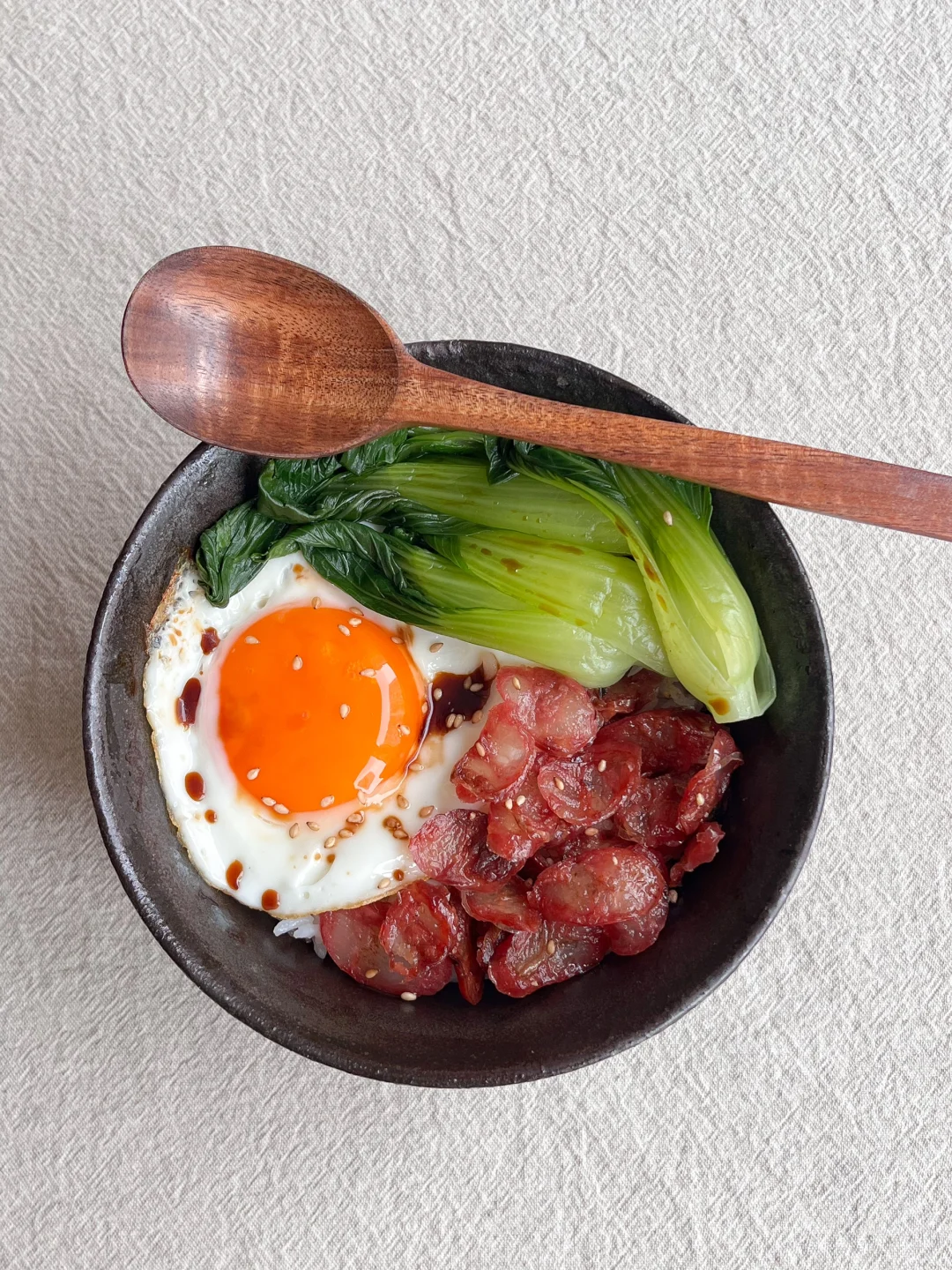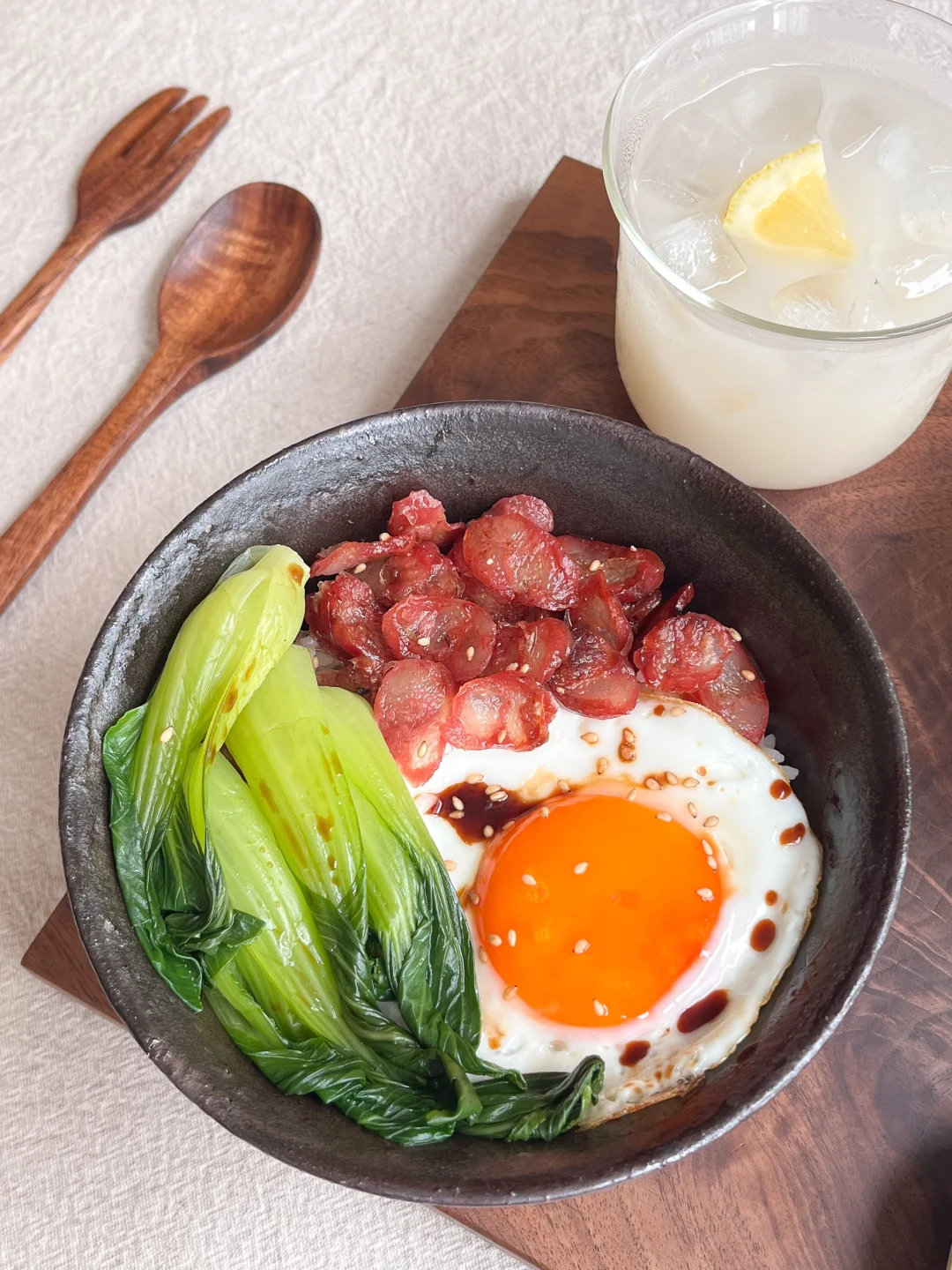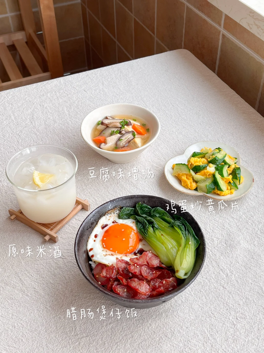 今日午餐: 腊肠“煲仔”饭🍱 豆腐味增汤🥣 鸡蛋炒黄瓜片🥒 原味米酒🍶 周末休息去西塔溜达了一圈 终于把家里断粮的辣椒粉买上了 还拎了两瓶米酒回来 我还是喜欢原味 满杯冰的快乐 今天中午吃简单的低卡腊肠“煲仔”饭 其实是偷懒 用电饭锅蒸的米饭 hhh 腊肠切薄片 用微波炉加热两分钟 能出来好多好多油 有小半碗 去掉油再把腊肠放到热乎乎的米饭上 烫几根青菜 调一点豉油汁淋在上面 比外面买的热量会低很多 做着也方便