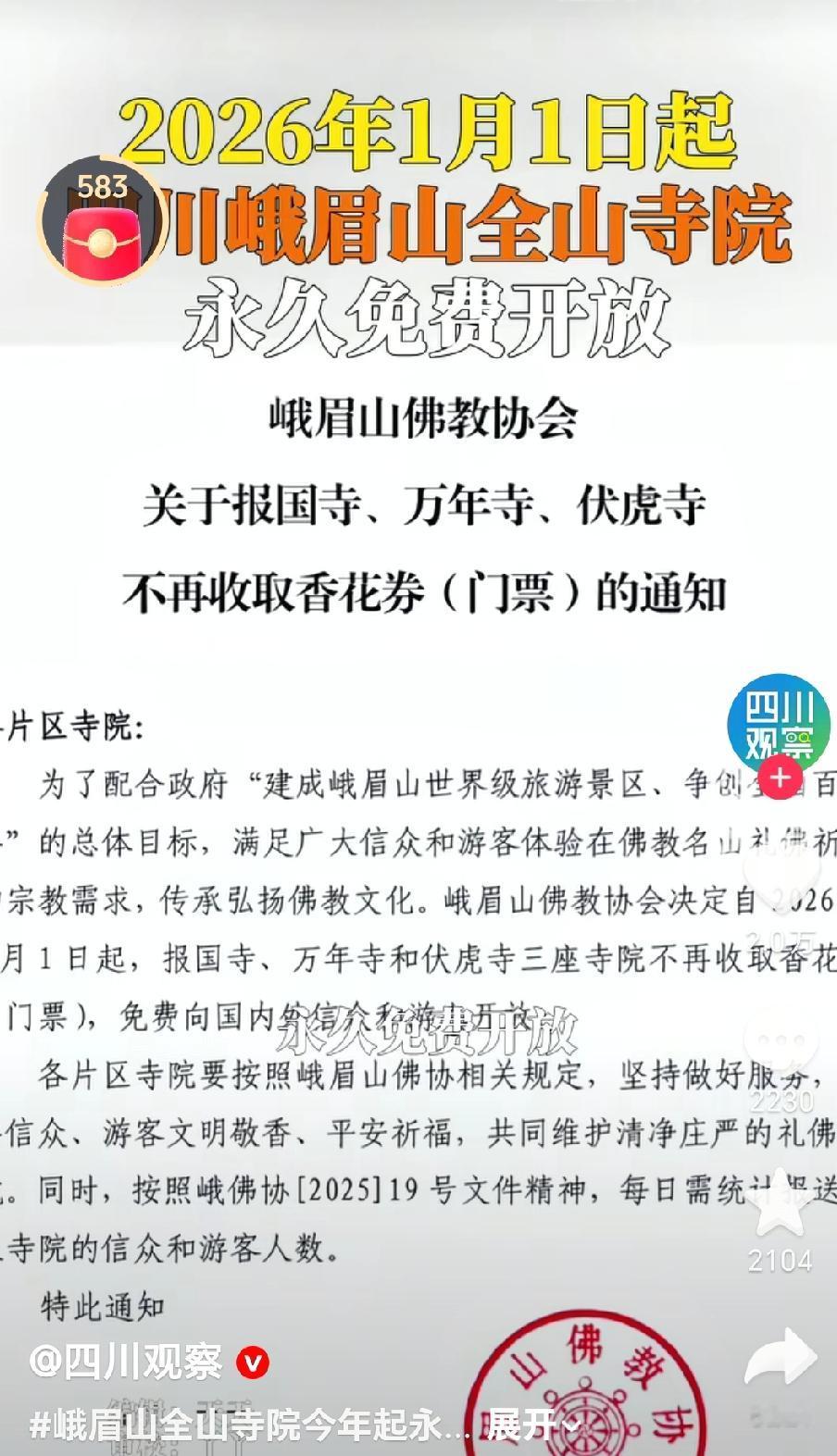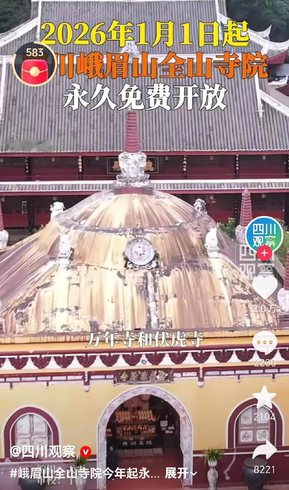 从2026年1月1日起,四川峨眉山全山寺院永久免费开放,具体涉及报国寺、万年寺、伏虎寺等寺院,将免收香花券(门票),向海内外信众游人开放。该消息由峨眉山峨眉山佛教协会发布,目的是配合政府“建成峨眉山世界级旅游景区、争创全国百强县”的目标,满足大众和游客宗教需求,传承弘扬佛教文化。(来源于@四川观察)