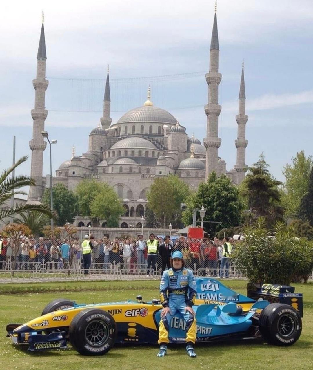 2005年,伊斯坦布尔,阿隆索在土耳其大奖赛前在苏丹艾哈迈德清真寺前与雷诺R25赛车合影。