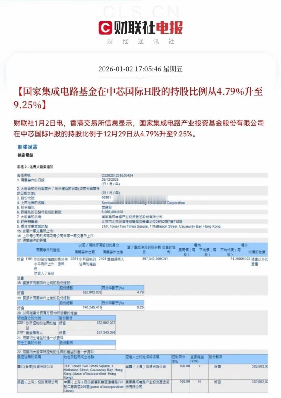 大基金重磅增持!中芯国际迎强力催化,半导体国产替代再添信心中芯国际迎来重磅利好加持,国家集成电路基金的大额增持动作,不仅为公司注入强劲动能,更向市场释放了半导体国产替代的明确战略信号,有望带动整个板块迎来估值修复行情。今日午后17点05分,香港交易所披露最新持股数据,国家集成电路基金对中芯国际H股的持股比例大幅提升,从原本的4.79%直接增至9.25%,增持幅度近乎翻倍,国家队此番低调且大手笔的加仓动作,含金量十足。作为半导体领域的国家队与专业产业资本,大基金的每一次增持都极具风向标意义。此次逆势加码中芯国际,一方面彰显了国家层面对半导体核心产业的高度重视,坚定支持国产芯片龙头突破发展;另一方面也清晰传递出信号——当前中芯国际估值处于战略性底部区间,公司长期发展前景被坚定看好。这一重磅利好消息公布后,港股中芯国际已率先迎来异动拉升,资金抢筹信号明显。节后A股开市,中芯国际大概率会迎来强势表现,其作为半导体板块的核心龙头,也有望带领整个半导体芯片赛道走出一波强势行情,成为市场资金聚焦的核心方向。对于半导体赛道而言,大基金增持中芯国际的动作,不仅是对单一龙头的认可,更是对整个国产替代进程的强力背书,将进一步提振市场对半导体产业的投资信心,产业链上下游优质标的也有望同步受益,迎来新的布局机遇。免责声明本文仅为个人市场消息解读与复盘,不构成任何投资建议,股市有风险,投资需谨慎。