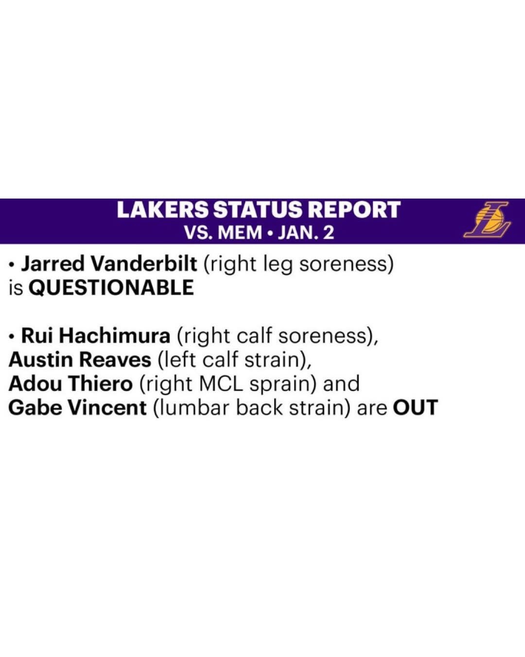 明天湖人主场迎战灰熊,八村垒、里夫斯、阿杜、文森特四人确定缺席,范德比尔特右腿酸