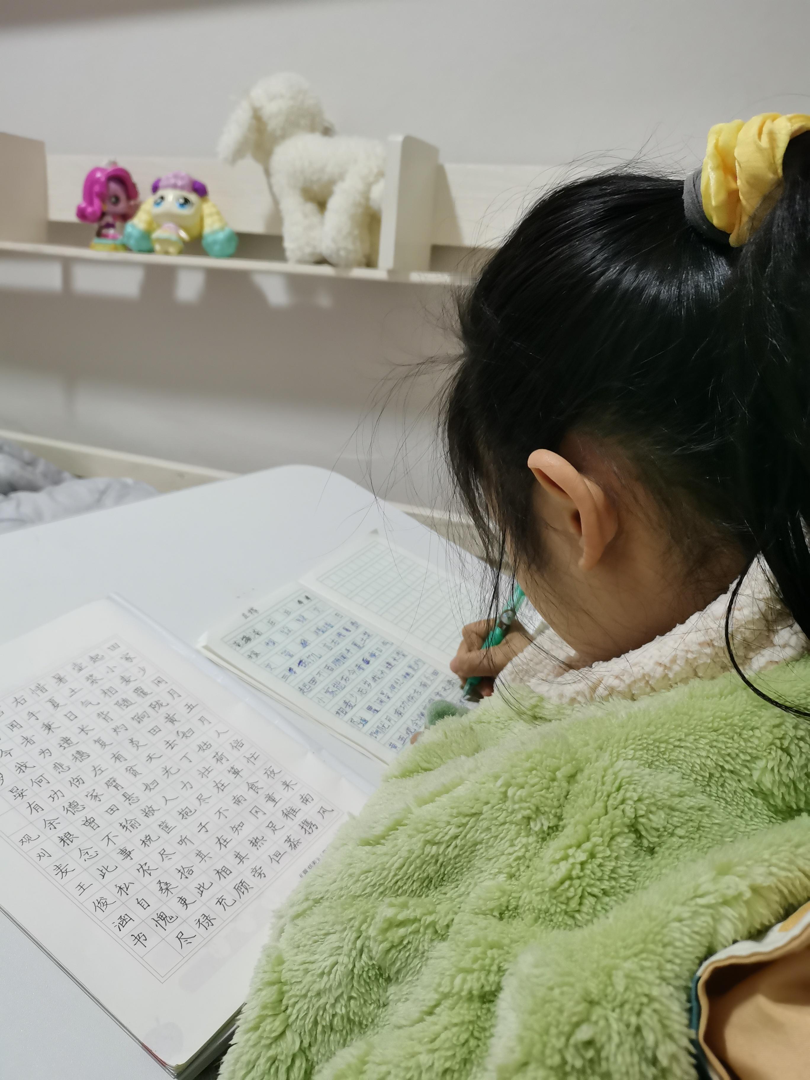 小孩今天不知为啥,突然想练字,平时怎么叫她练字都不愿。或许是因为我跟朋友聊天时夸了她。朋友说他女儿因为学美术的原因,字写的挺好。我就说,我女儿也是,因为从小画画,所以写字比一般小孩要好,而且她没练过字,就是靠画画的功底。就这么夸了一句,她就开始写字了,从厂里写到家里。