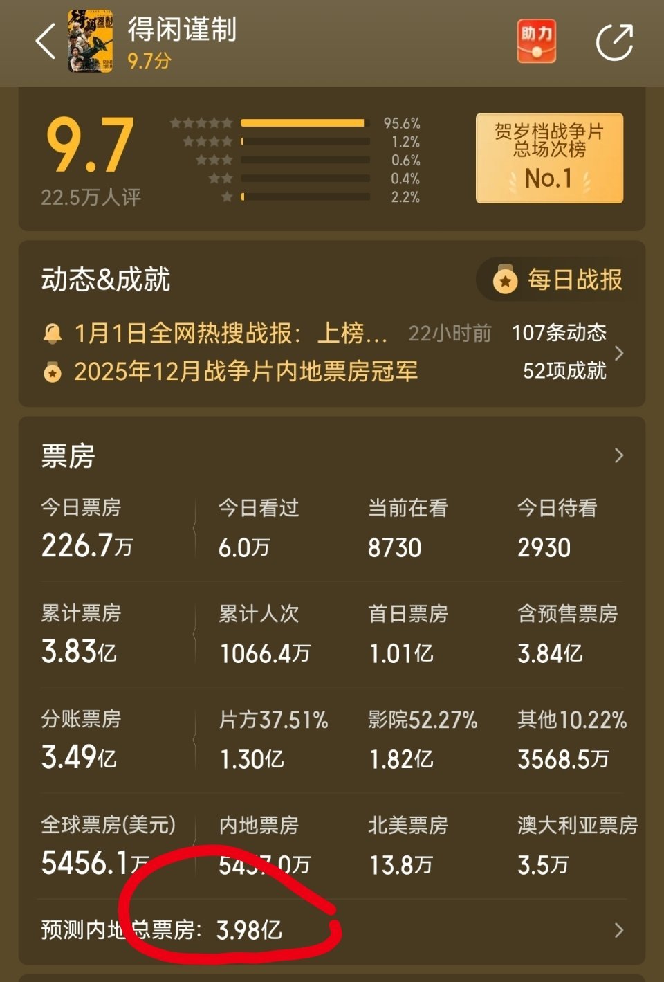 得闲谨制猫眼预测最终票房3.98亿。如果元旦排片多一点,那破四亿绝对妥妥的。