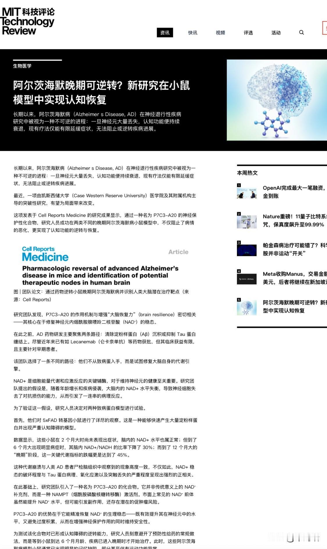 进入2026年,阿尔茨海默症(AD)的研究在“逆转”疾病进程方面取得了多项突破性进展,尤其是从“延缓衰退”向“功能恢复”迈出了关键一步。 以下是截至2026年1月的最新科学进展: 1. 能量代谢疗法:从小鼠实验实现“全面逆转” 2025年底至2026年初,多项研究聚焦于通过恢复大脑能量平衡来逆转认知衰退: NAD+平衡调控: 美国凯斯西储大学团队在《细胞医学报告》发表研究,发现大脑能量分子NAD+的严重缺失是AD恶化的主因。 药物突破: 研究人员使用名为P7C3-A20的精准调控药物,在晚期AD模型小鼠中不仅修复了受损脑组织,还使其记忆和认知功能完全恢复。这种方法不同于普通的NAD+补充剂,目前正准备进行人体试验。 中国科研成果: 中国科学院昆明动物研究所研发出一种新型多靶点活性化合物,通过调控葡萄糖代谢,成功逆转了中晚期模型小鼠的记忆缺陷。 2. 药物研发与审批新动态 2026年是AD治疗药物进入精细化和便捷化的一年: FDA优先审查: FDA已受理针对AD相关躁动症状的新药AXS-05的补充申请,并授予优先审查资格,预计将于2026年4月30日前做出审批决定。 给药方式升级: Lecanemab(勒奈单抗) 的皮下注射剂型在2025年获批后,2026年正推动实现患者家中的自动注射器给药,大幅降低了治疗门槛。 在研新药: 礼来公司的Remternetug(一种新型抗淀粉样蛋白抗体)的III期临床试验预计于2026年初完成,该药物支持类似“胰岛素笔”的皮下注射方式。 3. 诊断与早期检测的变革 血液检测普及: 2025年FDA批准了用于AD诊断的血液检测技术。到2026年,通过检测血浆中的 p-tau217 等生物标志物,医生可以更早、更便宜地发现疾病迹象,从而在神经元受损前进行干预。 联合用药预防: 研究发现,联合使用降压药和降脂药可将阿尔茨海默症风险降低约21%。 4. 未来趋势:免疫与多靶点治疗 免疫疗法: 科学家发现了控制淀粉样蛋白降解的两个大脑受体(SST1和SST4),这为开发比现有抗体疗法更便宜、更安全的新药提供了可能。 多病共治: 2026年,针对路易体痴呆等相关病症的 Phase III 临床试验也将启动,旨在通过更精准的生物标志物指导治疗。 总结: 尽管目前的“完全逆转”主要在动物实验中获得成功,但这些发现已将治疗思路从单纯的清除“斑块”转向了修复大脑“能量代谢”和“神经功能”,为2026年及未来的临床治愈带来了实质性希望。