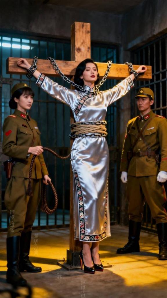 抗战影视剧镜头,在日军牢房里,美女特工被日军用铁链固定在十字架上,准备审讯。影视剧 抗战女特工