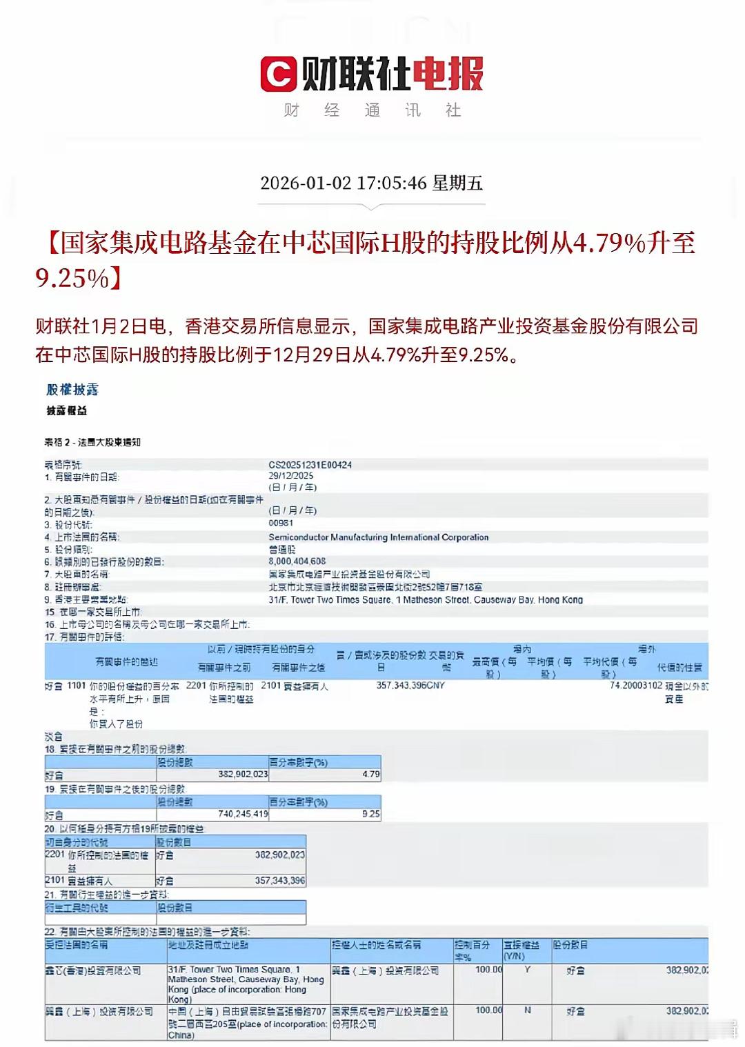 利好!大利好!中芯国际突发大利好消息!预计中芯国际要踩着风火轮起飞了,满仓中芯国际的,要乐开花了吧…下午5点05分,据香港交易所最新信息显示,国家集成电路基金在中芯国际H股的持股比例从4.79%升至到9.25%,好!太好了!国家集成电路基金悄悄地大幅增持中芯国际,这是向市场释放了明确的国产替代战略信号,对于中芯国际的股价来说是大利好,大基金作为国家队和专业的产业资本,其巨额增持相信会被市场解读为我国对半导体产业的高度重视,同时也标志着公司当前估值还处于战略性底部,未来前景依旧被高度看好,相信这会吸引大量市场资金跟随,形成向上合力,这对于中芯国际是大利好,对于整个半导体产业国产替代也是大利好!股民们!坐稳扶好!受此利好消息刺激,港股中芯国际已经起飞了,不出意外的话,节后A股的中芯国际也要火力全开了,甚至有望带动整个半导体芯片板块起飞,满仓这个方向,都准备好吃大肉吧!