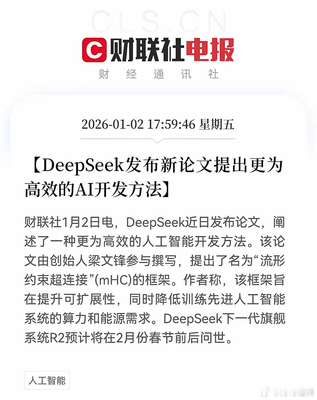 超级大利好!DeepSeek又放大招了不出意外的话,DeepSeek概念又要大爆发了。。。。。。财联社1月2日消息,DeepSeek发布由创始人梁文锋参与撰写的论文,提出“流形约束超连接(mHC)”框架,旨在提升AI系统可扩展性,降低训练先进AI系统的算力与能源需求,该技术有望缓解AI训练高成本痛点。当前训练大模型需耗费巨额算力与资金,如GPT - 4训练成本达数百万美元,高昂门槛将众多中小玩家挡在门外。mHC框架若落地,或大幅降低训练资源消耗,相当于让中小AI团队以更低门槛训练高性能模型,有望催生更多垂直领域AI应用,推动行业从“拼资金”向“拼技术”转变,加速AI生态多元化。从资本市场视角看,DeepSeek采用“论文+产品”路线,计划于2月春节前后推出下一代旗舰系统R2,此举与英伟达等科技巨头的技术驱动逻辑相似,既能强化自身硬科技形象,也为商业化落地铺路,有望提升市场对其估值预期,巩固其在AI赛道的竞争力。若mHC框架效果如论文所述,未来AI开发效率将大幅提升,训练成本降低或吸引更多创业者入局,催生现象级AI产品,也为投资者在AI赛道挖掘潜力标的提供更多机会。