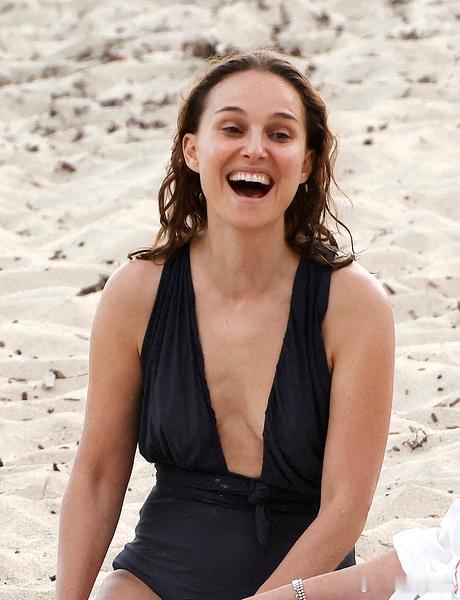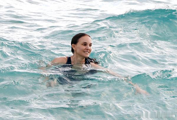 更多Natalie Portman娜塔莉波特曼在圣巴特海边度假的图,波波在沙滩上享受阳光后下海泡水感受清凉