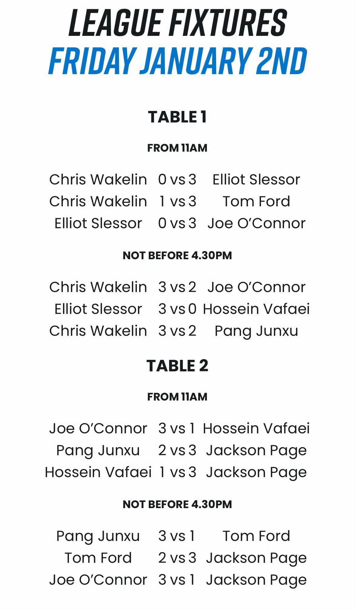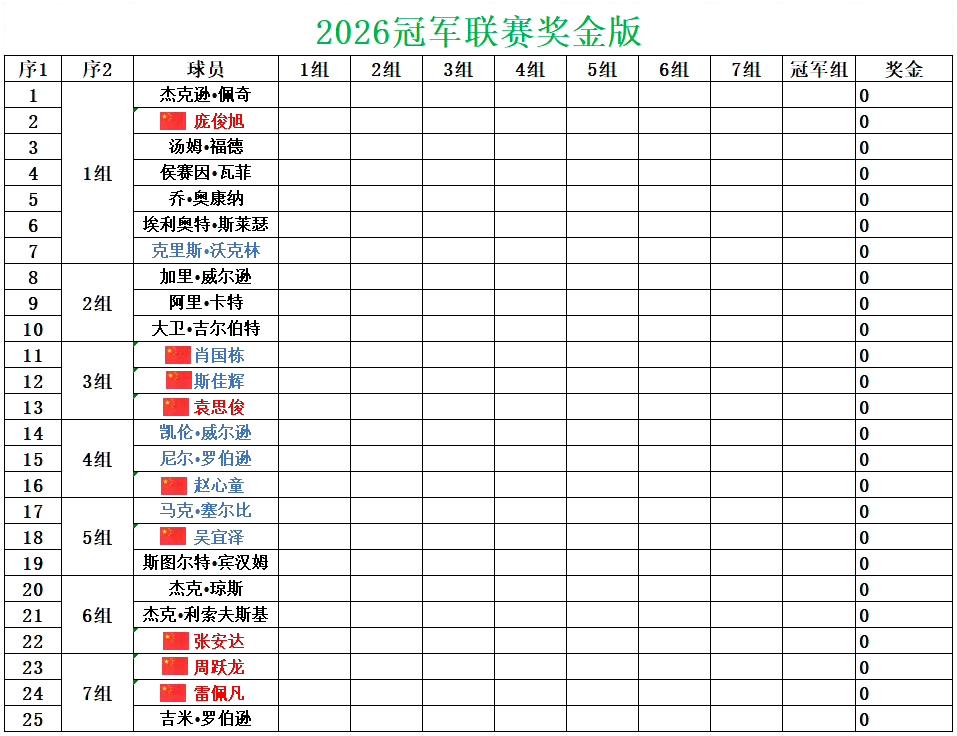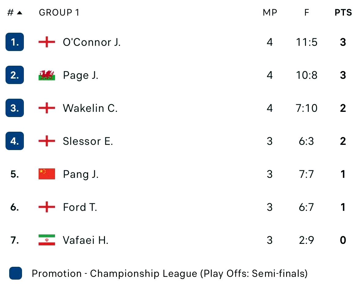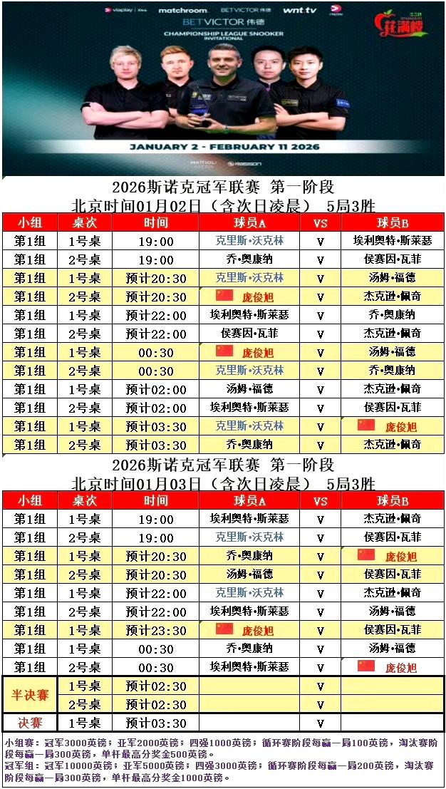 新的一年,斯诺克冠军联赛,新晋斯诺克苏格兰公开赛冠军韦克林就轰出一杆147。奖金只有500英镑…… 个人职业生涯第1杆、本赛季第17杆、2026年第1杆、斯诺克历史第234杆。 小组前四名进入半决赛,胜者晋级决赛。庞俊旭1胜2负,很遗憾最终排名第五。 庞俊旭2-3韦克林 庞俊旭2-3佩奇 庞俊旭3-1汤姆福德