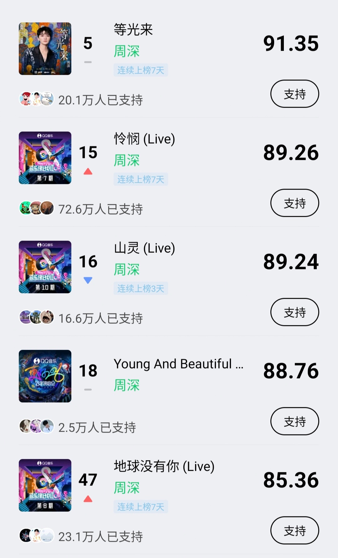 周深 📣 1.2 巅峰潮流 📣米米们好,每歌做6个动作路径:Q音-乐馆-排行-潮流巅峰📍重点做新歌✅《等光来》✅《怜悯(live)》✅《山灵(live)》✅《Young And Beautiful(live)✅《地球没有你(live)》完成『支持』让更多人听到深深