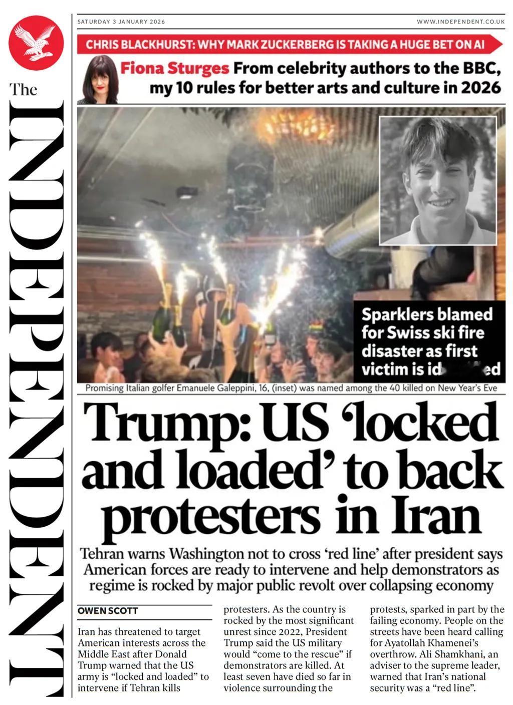 英国《独立报》报道,伊朗警告美国不要在因金融困境和经济崩溃引发的重大动荡后干预。 美国总统特朗普表示,美国“准备就绪”支持伊朗抗议者 ,德黑兰警告华盛顿不要越过“红线”,此前美国总统表示,在伊朗因经济崩溃引发大规模民众反抗而政权动荡之际,美军准备好进行干预并帮助示威者。 照片还描绘了瑞士滑雪度假村酒吧内的一幕,一场致命火灾夺走了至少40人的生命。 遇难者中包括仅17岁的意大利籍埃马努埃莱·加莱皮尼,他也被拍到。