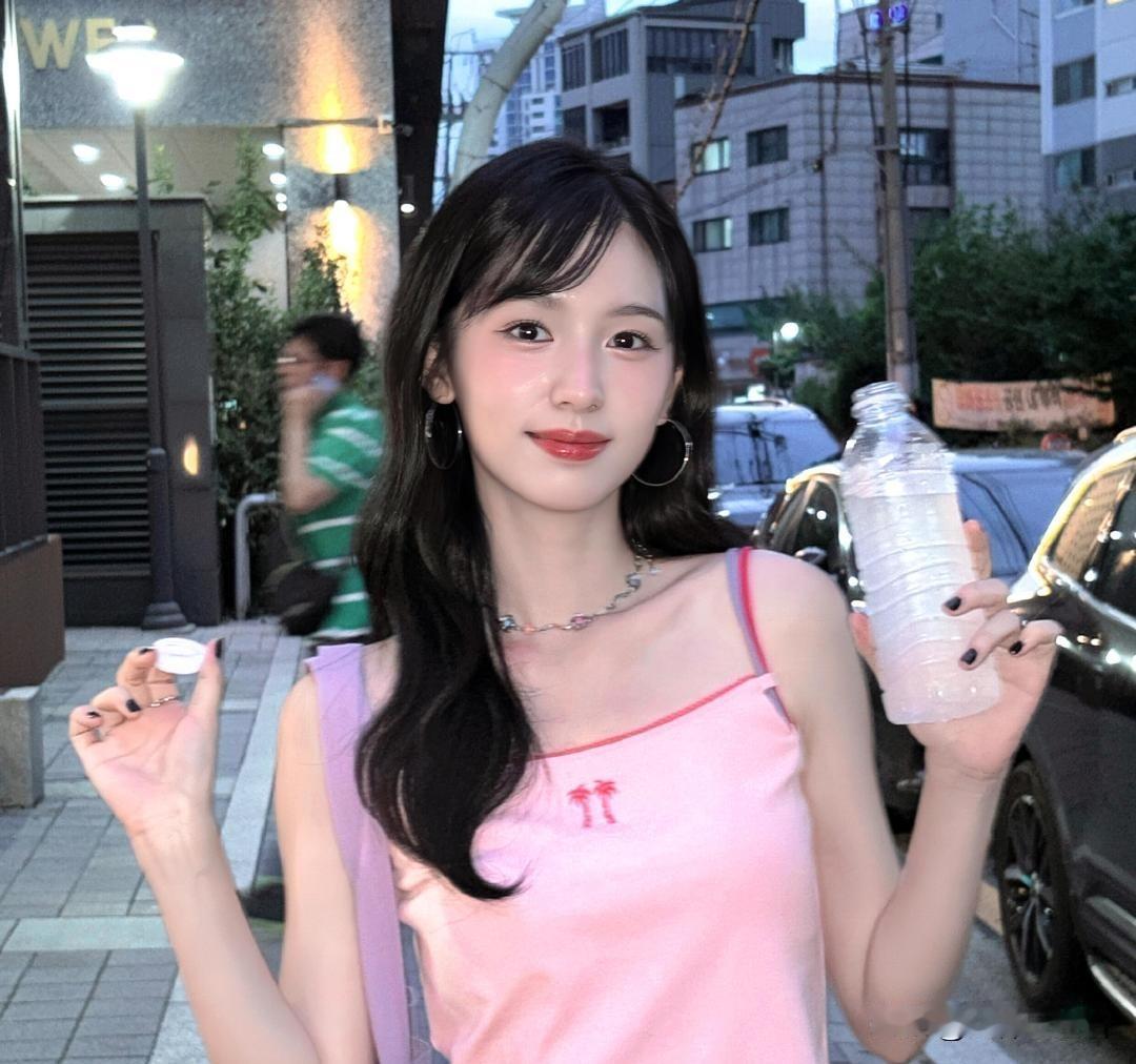 她穿着粉色连衣裙,手拿彩色包包,笑得真甜!