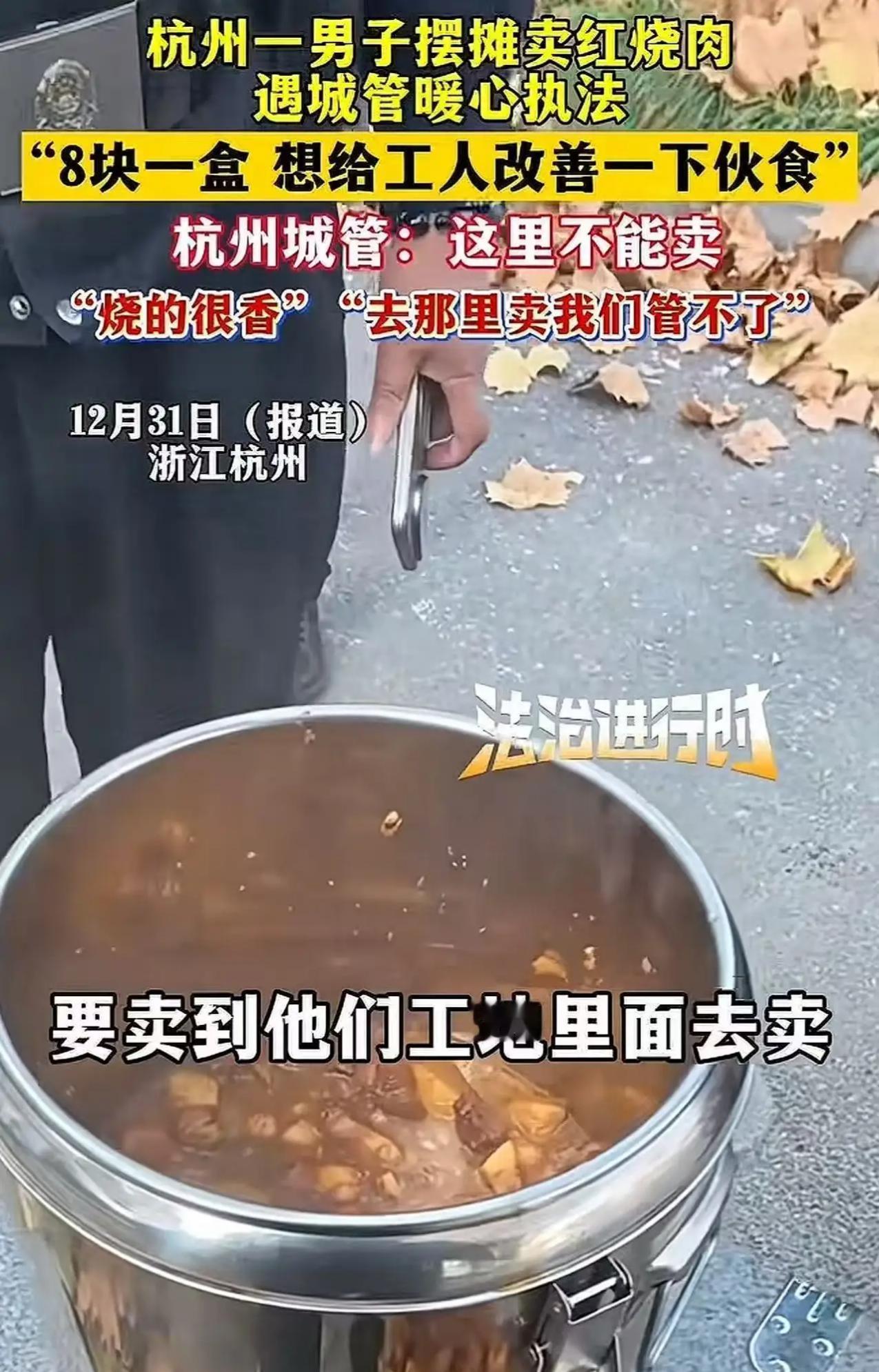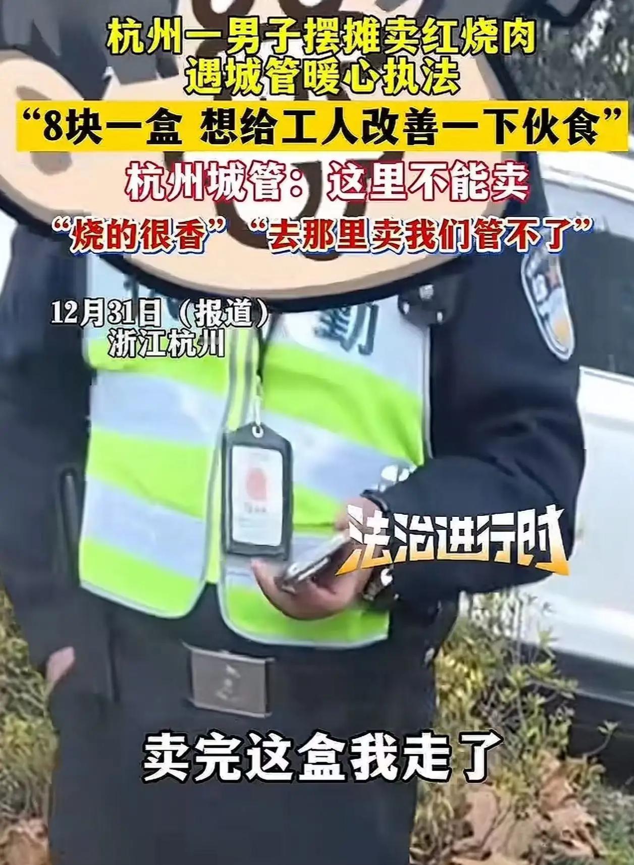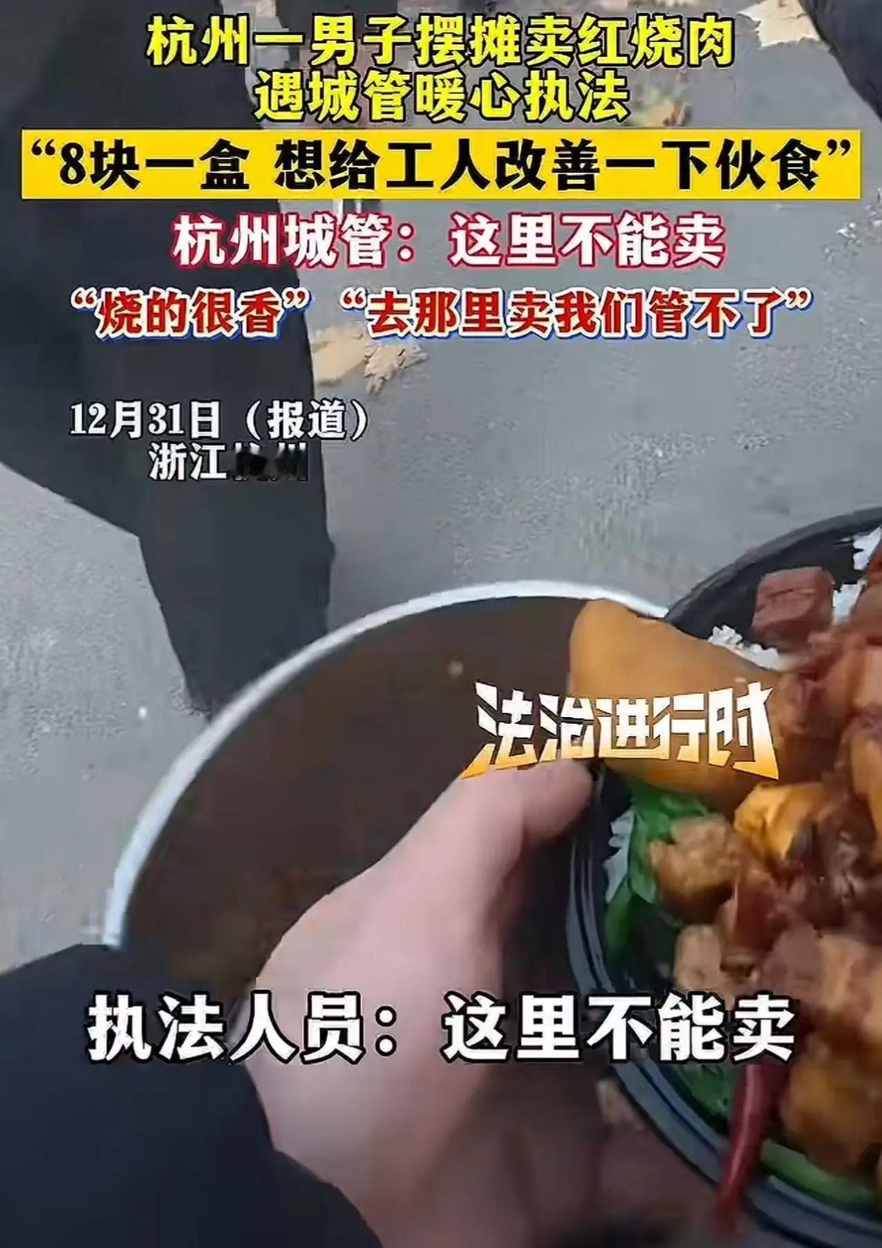 杭州城管太暖心!工地旁8元盒饭摊主遇劝阻,后续一句话让男子当场泪目 杭州城管又凭暖心操作火出圈!近日,一名男子在工地附近摆摊卖盒饭,刚支好摊子就被巡逻城管上前提醒“这里不能卖”,暖心一幕也从此刻开始上演。 男子见状连忙满脸歉意地解释,自己知道占道摆摊不合规,之所以在这里售卖,是心疼工地工人起早贪黑干活辛苦,8块钱一份的盒饭分量给得足足的,荤素搭配齐全,只求让工人们能吃口热乎饭填饱肚子,绝不会久留,卖完手里这几盒就立马离开。 本以为会被强硬驱赶,没想到城管听完后没有半句指责,反而温柔叮嘱:“知道你是好心,但这里人多车杂不安全,也不符合规定,你换个合规的便民点位,我们帮你留意着,放心卖,不耽误工人们吃饭。” 简单一句话,瞬间戳中男子泪点。他原本还在担心生计受影响,更怕耽误工人们吃平价饭,城管的通情达理,既守住了城市管理的底线,又给了普通人最大的善意。 这段暖心视频传到网上后,网友纷纷点赞:杭州城管这波真上大分!执法有力度更有温度,没有一刀切的冷漠,而是站在双方角度着想,既维护了市容秩序,又体谅了摊主的善意与工人的不易。 真正的城市管理,从不是冰冷的规则执行,而是带着人情味的换位思考。杭州城管用实际行动证明,刚柔并济的执法,才是最动人的城市风景,也让这座城市更有温度。城管暖心善举