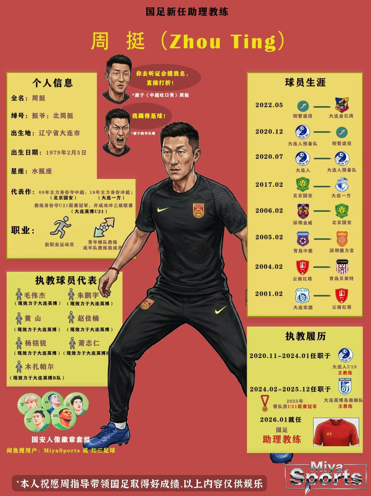 北京国安北京国安 挺爷加入国足!前国安硬汉队长再挑大梁🌡国安球迷对周挺的名字一定不陌生!球员时代,他作为国安主力边后卫,🔥用硬朗的防守和犀利的助攻,助球队夺得2009年中超,“挺爷”的绰号也成了工体看台的经典标签。🏟球场上是敢拼敢言的铁后卫,累计百张黄牌的“中超牌王北周挺”形象,更是刻在了中超球迷的记忆里👺。退役后的周挺转身投入青训,2024年执掌大连英博U19教鞭,率队以全胜战绩夺得全国U21联赛🙀,还成功带队冲乙,把青训成果实实在在地踢了出来。如今他加入邵佳一的国足教练组担任助教,⛳从国安挺爷到国字号教练,⚽周挺完成了又一次身份蜕变。他的赛场经验和青训心得,🕹或许能为国足带来新的思路。这位大连硬汉携手邵佳一指导,能给国足带来哪些改变?咱们聊聊你的期待,🎞也祝挺爷在国家队工作一切顺利!……