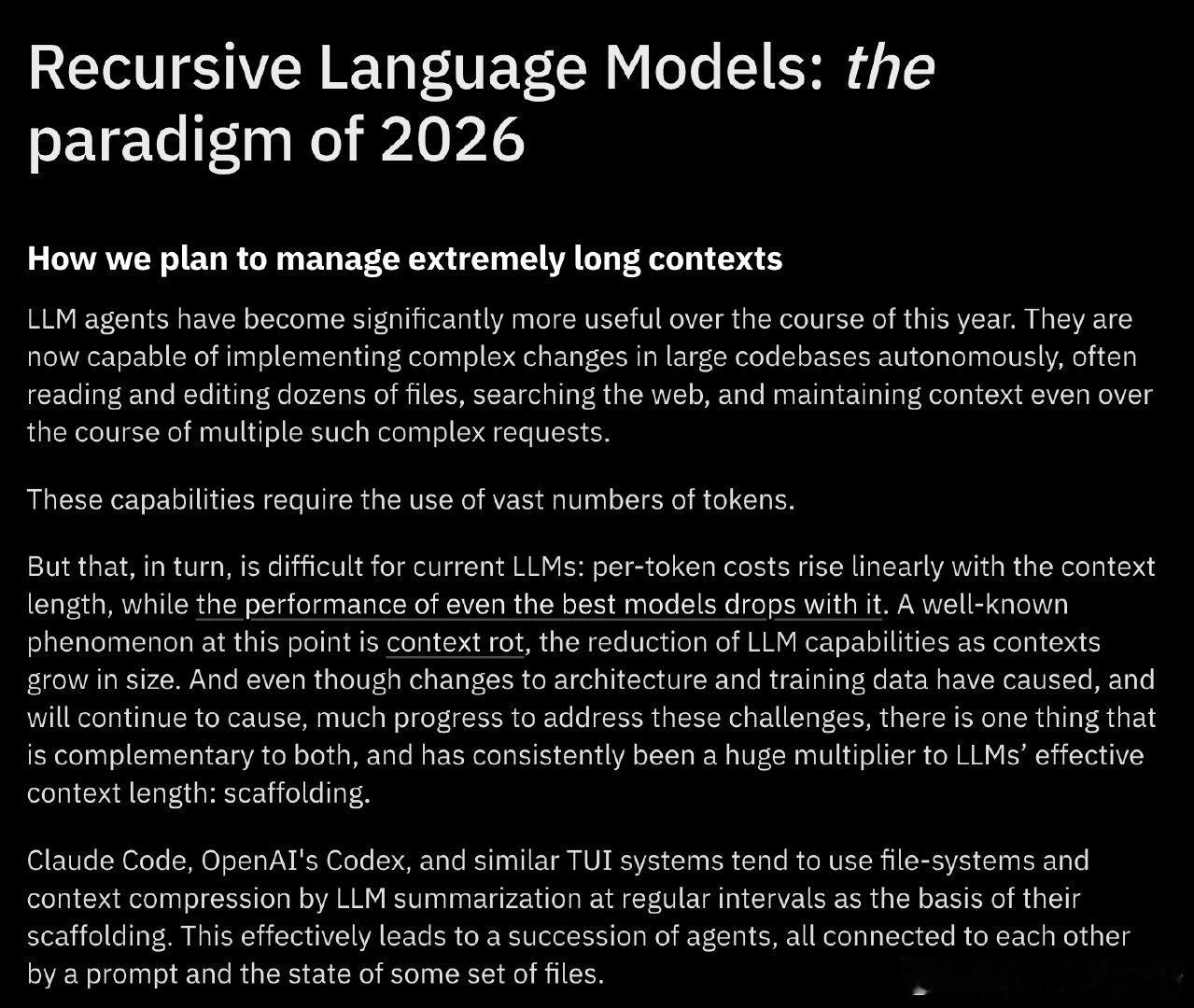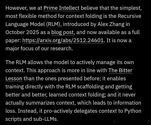 【当AI学会管理自己的记忆:递归语言模型如何终结"上下文腐烂"难题】Prime Intellect发布了递归语言模型(RLM),一种全新的推理策略,让AI不再被动接受冗长的提示词,而是主动将其视为可操作的动态环境。传统大模型有个致命软肋:上下文窗口越长,信息丢失越严重,业内称之为"上下文腐烂"。你给模型塞进去100页文档,它可能只记得开头和结尾,中间的关键信息早已模糊。RLM的解法很巧妙——它把输入数据当作Python变量来处理,模型自己决定检查哪些片段、拆分哪些任务、递归调用哪些子模块,整个过程在一个持久化的Python REPL环境中完成。几个核心突破值得关注:第一是"上下文折叠"。不同于传统RAG那种先总结再检索的套路(总结必然丢信息),RLM让模型主动把特定任务委派给子模型和Python脚本处理,信息完整性得以保留。第二是效率惊人。测试显示,用RLM包装的GPT-5-mini在长上下文任务上击败了标准GPT-5,而主上下文token消耗不到后者的五分之一。这意味着什么?小模型加上好策略,可以干掉大模型的暴力堆参数。第三是长程任务的连贯性。通过强化学习让模型端到端管理自己的上下文,系统能在跨越数周甚至数月的任务中保持思路清晰。这对真正的AI Agent至关重要——你不可能指望一个每隔几分钟就"失忆"的助手帮你完成复杂项目。同步发布的INTELLECT-3是一个1060亿参数的MoE模型(120亿激活参数),在Prime Intellect的完整强化学习栈上训练,性能对标闭源前沿模型,但完全开源开放权重。社区讨论中有个问题很尖锐:这和OpenAI、Anthropic现有的上下文管理方案有什么本质区别?答案在于层级不同。现有方案大多是外部编排,是"绕过"问题;RLM则把上下文管理内化为模型推理循环和训练目标的一部分,是"解决"问题。当任务需要持续运行数天甚至数周时,这个区别就会显现出来。有人评论说这个思路"显而易见到奇怪为什么不是默认做法"。确实,人脑处理短期记忆和规划任务时,本质上就是这么运作的——选择性关注、分块处理、递归调用。但"显而易见"和"能做好"之间往往隔着五年的工程积累,就像推理能力的研究2019年就有了,真正爆发要等到o1。更深一层看,这触及了一个根本问题:如果你想造出超越人类的智能,或许应该从无限递归上下文开始,因为这正是人类认知的运作方式。一个被冻结在时间中的大脑不可能真正学习或理解任何东西。迄今为止发布的每一个大模型,要么被冻结在时间中,要么在上线后不久就因为上下文问题而崩溃。当模型能够程序化地"窥视和检索"自己的提示词时,暴力扩展上下文窗口的路线是否已经过时?这个问题的答案,可能决定着下一代AI架构的走向。reddit.com/r/singularity/comments/1q1vcvf/prime_intellect_unveils_recursive_language_models