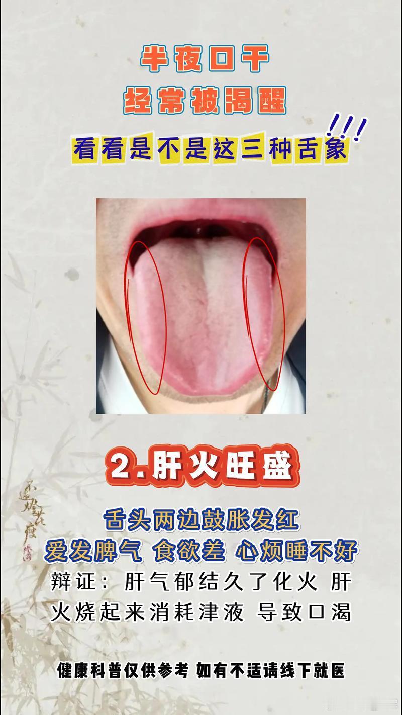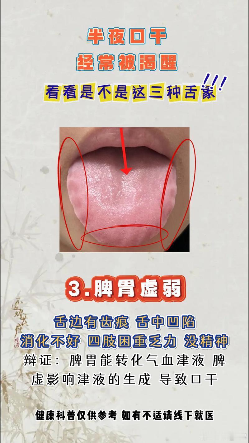 “口干不一定都是缺水”这一现象的解读非常准确,并且用生动的比喻(“水泵”)和清晰的中医理论,将“阳虚津不上承”这一核心病机阐释得通俗易懂。您已经抓住了问题的精髓。一、核心鉴别要点:一张表快速区分为了方便大家自我初步判断,可以将两种口干的关键区别总结如下:特征阳虚型口干(有水难润)阴虚/缺水型口干(无水可润)口渴感口干燥,但不想喝水,或只喜少量热饮。口渴欲饮,且想喝凉水、冰水。饮水后喝水后不能解渴,甚至胃胀、不适。喝水后能迅速缓解。全身症状畏寒怕冷,四肢不温,精神不振,面色苍白,小便清长,大便稀溏。可能伴有咽干鼻燥,皮肤干燥,小便短黄,大便干结,心烦发热。舌象舌质淡胖,舌苔白滑。舌质红,舌苔少或干,甚至无苔。脉象脉沉迟或微弱。脉细数。 二、调理策略:如何“温阳化气”您提到了“温阳化气”的核心原则,以及理中丸、金匮肾气丸等经典方剂。在此基础上,可以补充更具体、可操作的日常生活调理方法,形成“药-食-动-养”的完整方案。1. 饮食调理:吃出阳气多吃温性食物:如生姜、大枣、桂圆、山药、南瓜、羊肉、鸡肉、鲫鱼。烹饪时多放些葱、姜、蒜、花椒、肉桂等温性香料。喝对“水”:将白开水换成生姜红枣茶(生姜3片、红枣3枚掰开,煮水代茶饮)或肉桂苹果茶,既能补充水分,又能温补脾阳。严格忌口:杜绝一切冰镇饮品和食物,少吃生冷瓜果(如西瓜、梨、火龙果等,如想吃可蒸煮后温热服用)。2. 生活方式:养出阳气运动生阳:选择温和的、能让人微微出汗的运动,如快走、慢跑、太极、八段锦、瑜伽。运动时间最好在上午阳气升发之时,避免夜晚剧烈运动耗散阳气。艾灸补阳:这是补阳非常直接有效的方法。可艾灸关元(脐下3寸)、气海(脐下1.5寸)、足三里(外膝眼下3寸)等穴位,每穴15-20分钟,每周2-3次。保暖避寒:尤其注意腰腹部、背部、脚踝的保暖。夏季避免空调直吹,睡前可用热水泡脚(可加艾叶、生姜),泡至身体微微发热。3. 中成药选择(务必辨证或在医师指导下使用)脾胃虚寒为主(脘腹冷痛、食少便溏):附子理中丸(比理中丸温阳力量更强)。脾肾阳虚(腰膝酸冷、夜尿频多):金匮肾气丸(温补肾阳,化气行水)。中焦气化不利,水湿内停(口干不欲饮,或水入即吐,头晕心悸):五苓散(通阳化气利水)。三、一个常见的特殊类型:痰湿中阻还有一种常见情况容易被忽略,即痰湿阻滞中焦,导致津液输布通道不畅,不能上承于口,也会出现口干不欲饮。这类人通常伴有:口中黏腻,或有甜味。身体困重,头重如裹。舌苔厚腻。调理方向是健脾祛湿、化痰理气,而非单纯温阳。可用二陈丸、平胃散等方剂化裁。总结与提醒您最后的总结非常到位,这正是中医“整体观念”和“辨证论治”的体现。面对口干,我们学会了:先辨阴阳:是“缺水”的阴虚热象,还是“动力不足”的阳虚寒象?再找根源:是脾、是肾,还是兼有痰湿?对症施治:补水、温阳、化湿,方法截然不同。最后的重要提醒:如果口干症状持续不缓解,或伴有糖尿病(“消渴症”)、干燥综合征、甲状腺功能异常等疾病迹象,务必及时就医,进行现代医学检查,明确诊断,中西医结合治疗才能获得最佳效果。口干不一定都是缺水 生活中有许多人出现口干舌燥的感觉,第一反应就是“缺水了”,于是大口喝水,可结果喝的肚子胀的难受,总跑厕所,口干却仍不缓解。告诉你,这是因为阳气不足,津液无法上承口腔。这就是“无水可润”与“有水难润”的区别。中医如何解读这种“有水难润”呢。中医认为,津液是人体一切正常水液的总称,能濡养脏腑、润泽肌肤、滋养口腔,而津液在体内的输布与代谢,离不开阳气的温煦与推动。阳气就像身体里的“水泵”,负责将津液从下焦向上输送至口腔、咽喉等部位,维持口腔的湿润状态。当机体阳气充足时,“水泵”动力十足,津液循行顺畅,口腔自然滋润;可一旦阳气亏虚,“水泵”运转无力,即便体内津液并不匮乏,也无法被顺利输送到口腔,就会出现口干不想喝水或饮后不解渴的典型表现。这类口干和“缺水型”口干有着明显区别:缺水导致的口干,多伴随咽喉干燥、皮肤紧绷、小便短黄,喝水后能快速缓解;而阳气不足引发的口干,常伴有畏寒怕冷、四肢不温、大便溏薄、舌淡苔白滑、脉沉迟等阳虚症状,喝水过多反而会加重脾胃负担,出现腹胀、腹泻等问题。阳气不足导致津液不能上承的原因,多与生活习惯息息相关。长期贪凉饮冷,比如频繁喝冰水、吃生冷瓜果,会损伤脾胃阳气;熬夜耗伤阳气,加之缺乏运动,气血运行不畅,阳气无法正常生发;年老体弱或久病不愈,也会导致肾阳亏虚,因为肾阳是人体阳气的根本,肾阳不足则全身阳气的推动作用都会减弱。针对这类阳虚型口干,调理的核心并非“补水”,而是“温阳化气”,让身体的“水泵”重新恢复动力。在中医方药调理上,需辨证施治。脾胃阳虚者,可在医师指导下选用理中丸等方剂,温中健脾;肾阳不足者,可选用金匮肾气丸等方剂,温补肾阳,以助阳气蒸腾津液,上润口舌。由此可见,中医看待口干,并非只关注“津液”这一物质层面,更重视“阳气”的功能作用。当出现口干症状时,不妨多留意身体的其他表现,别再一味地大量喝水。分清是“缺水”还是“阳虚”,对症调理,才能从根源上解决问题,让身体恢复阴阳平衡的健康状态。