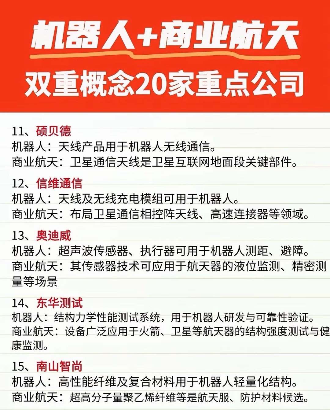 “机器人 + 商业航天”双重概念20家重点公司梳理涵盖机器人与商业航天领域的核心技术与产品布局2025 年航天机器人市场规模达 85 亿元,同比激增 120%,这两大硬核赛道深度融合,正迎来爆发期。有 20 家重点公司涵盖了核心技术与产品布局。比如昊志机电,谐波减速器与伺服电机技术成熟,还是机器人关节核心供应商,其精密主轴能用于航天材料加工,传动技术适配卫星太阳能帆板驱动机构,实现双领域技术复用。还有汉威科技,MEMS 传感器用于火箭检漏,市占率超 25%,电子皮肤年产能 300 万片,供货宇树、优必选等。这 20 家公司凭借双重技术布局,成为赛道核心玩家,未来发展值得期待!
