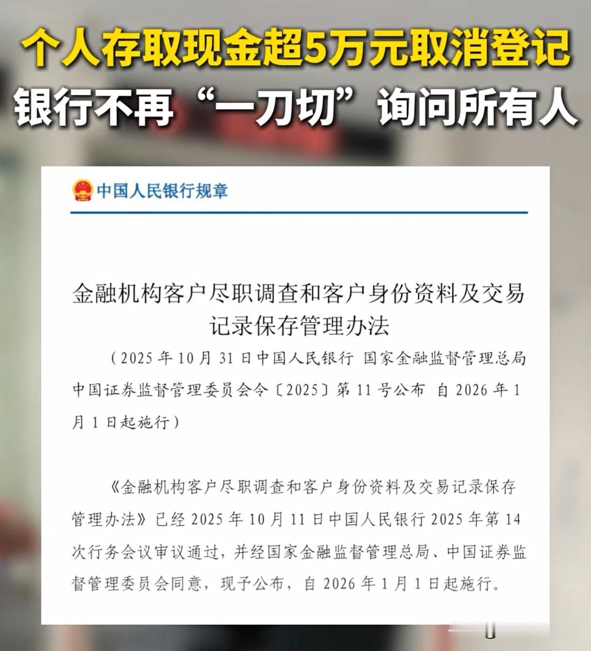 “五万元存取终于自由了”!2026年1月1日起,个人存取现金超5万元不再“一刀切”登记问询,但如果是出现较高洗钱风险时依然会被“强化调查”。 以前我们去银行存取5万元现金,可能还要被各种问询,让人心里五味杂陈。从新年伊始,对大家取钱自由捆绑式的限制行为也算是成为历史了! 很多网友表示:早就该如此了,银行管控那么严格,为啥骗子还会从银行取走那么多钱。大家已经不关注这个问题了,请问,去银行存款,然后被银行工作人员盗用,这事应该找谁负责,或者说找谁要回来。是不是应该银行赔付用户,然后由银行追回来? 不过现在的银行还有个毛病需要继续优化才行!包括四大银行都是如此,也很让人反感!如果你的银行有笔存款,如果一个月两个月不动账,就各种短信“轰炸”提醒要求你向同名账户转账动账一次,以避免冻结!这又是为何?每次我收到这样的短信都很烦,真想把银行卡里的钱都取出来了!大家有没有同样的情况呢? 个人存取款 银行取钱新规定 银行取款新规 存款取款新规