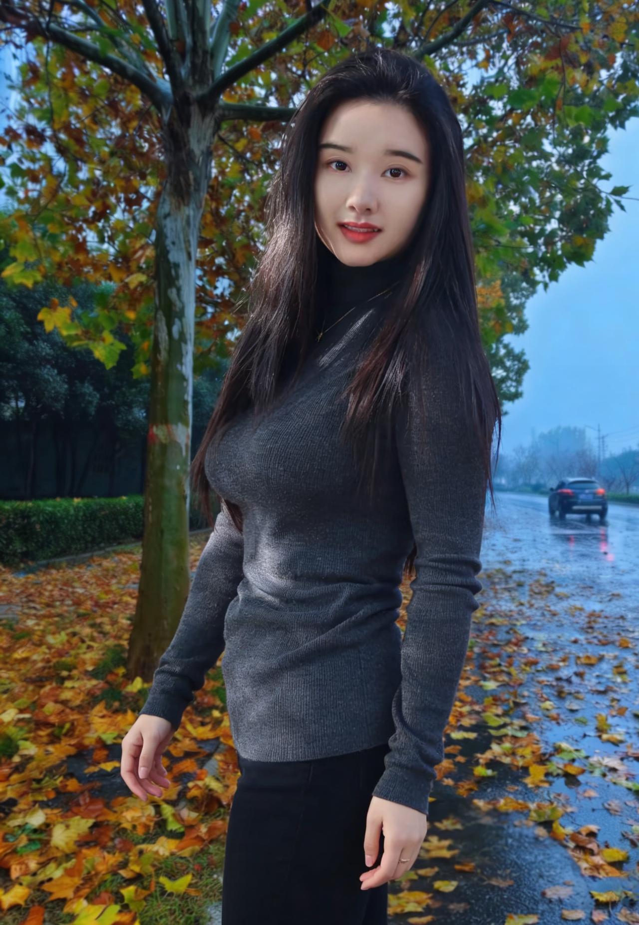 梧桐叶铺了一街的金黄 雨痕湿了路面,也湿了秋的眉骨 她站在落满碎叶的街边 灰调的高领,裹着晚秋的薄凉 ~ 长发被风撩起,缠着秋思 却遮不住眼底的温软 高领的针织,贴着颈间的暖 像把自己,裹进了温柔的丝茧 ~ 路面的反光,映着她的身影 梧桐的枝桠,剪着灰蓝的天 车影掠过,留下一串轻响 她站着,与秋的萧瑟,温柔缠绵 ~ 指尖的凉,抵不过心底的热 她的美,是秋街里的一抹暖色 在落叶的飘零里,站成坚定的风景