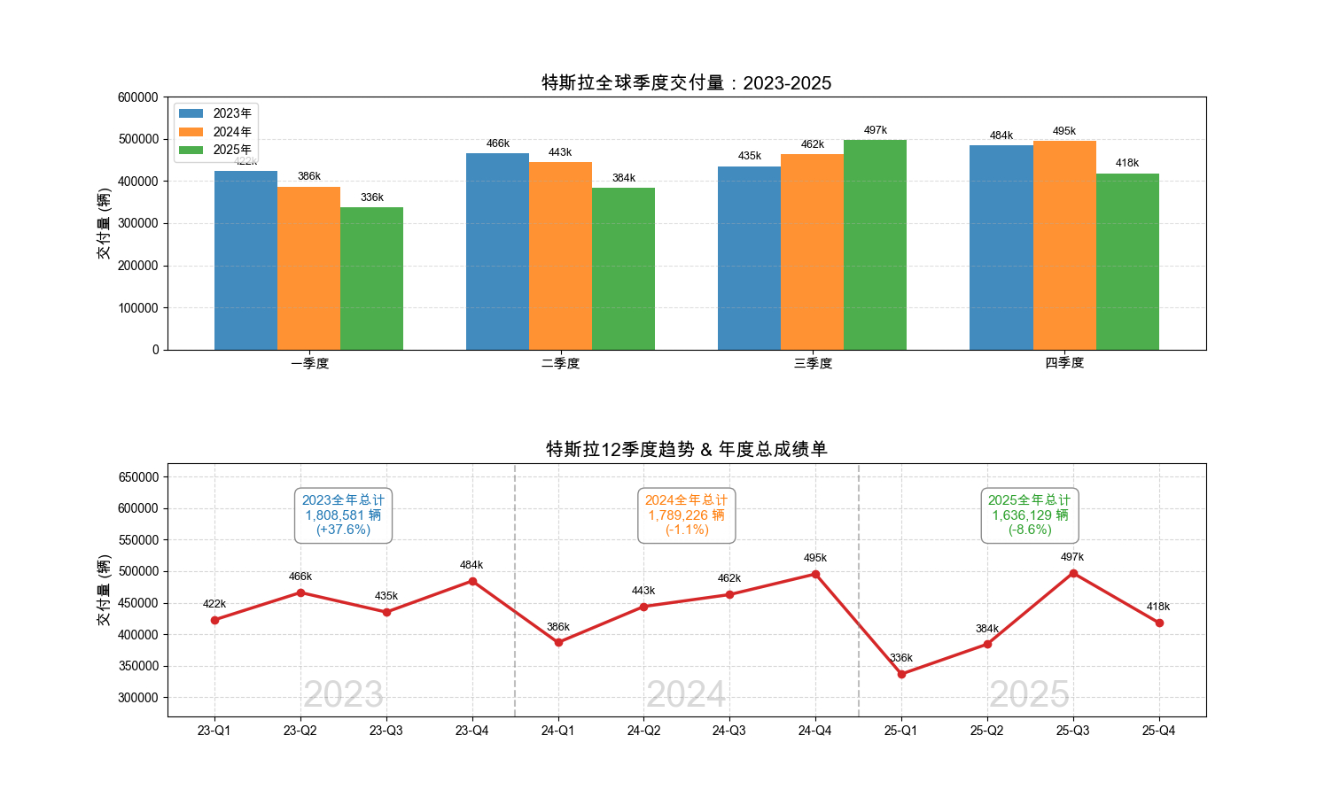 特斯拉近三年(2023-2025)全球交付情况,2023年达到顶峰,2024年小跌1.1%,2025年同比下跌8.6%。