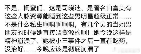 所有顶流都睡完了iamroosie司晓迪好像是有名的白富美 我看现在有人说她是ss,是梦女病犯了,我觉得如果以她的资源人脉也不是不可能。。。你们觉得呢?