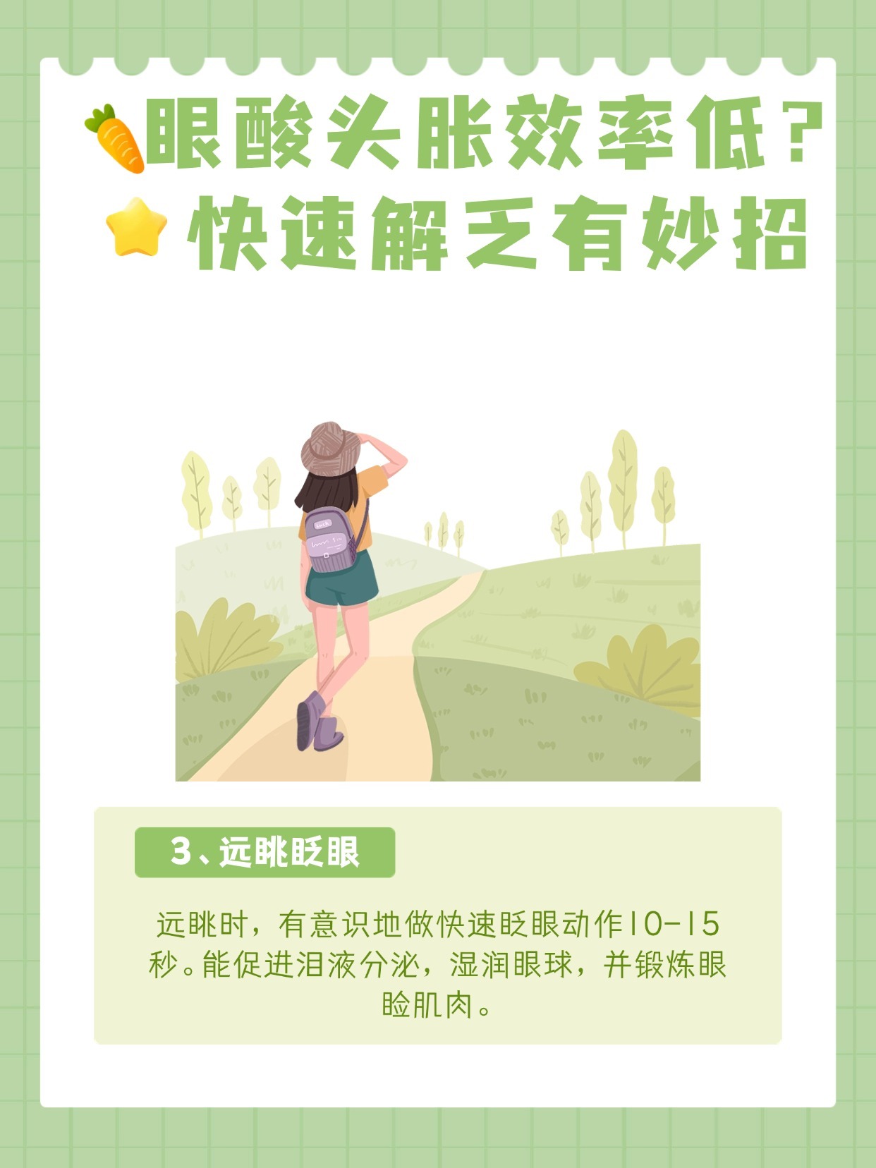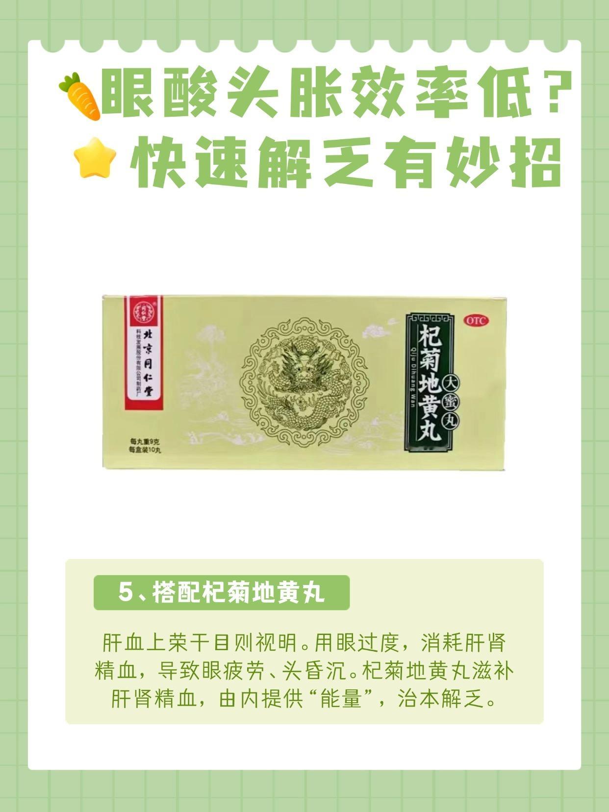 职场养生新选择宝子们,有没有感觉每天下午工作到一半,眼睛就开始酸胀、发干,连带着头也昏昏沉沉的,注意力怎么都集中不了?这不仅是眼睛累了,更是身体在提醒你:肝血和肾精被过度消耗了!中医讲“久视伤血”,肝开窍于目,且“目受血而能视”。长时间盯着屏幕,透支的不仅是视力,更是宝贵的肝肾精血。精血亏虚,无法充分濡养眼睛和大脑,就会出现眼酸、头胀、效率低下。单纯滴眼药水只能暂时缓解,补充“内在能量”才是根本。眼酸头胀效率低?5个快速解乏小妙招,给身体充充电!1️⃣ 刮拭眉弓用食指指节,从眉头沿眉骨向眉尾方向轻轻刮拭,每侧20次。可快速放松眼周肌肉,缓解额部紧张。2️⃣ 绿茶熏眼泡一杯绿茶,微闭双眼,将眼睛凑近杯口上方,感受温热蒸汽熏蒸1分钟。绿茶明目,蒸汽活血,焕发眼周神采。3️⃣ 远眺眨眼远眺时,有意识地做快速眨眼动作10-15秒。能促进泪液分泌,湿润眼球,并锻炼眼睑肌肉。4️⃣ 指腹叩头十指微屈,用指腹由前向后轻轻叩击整个头部1分钟。促进头部气血循环,提神醒脑,缓解用脑过度导致的昏沉。5️⃣ 搭配杞菊地黄丸肝血上荣于目则视明。用眼过度,消耗肝肾精血,导致眼疲劳、头昏沉。杞菊地黄丸滋补肝肾精血,由内提供“能量”,治本解乏。对抗用眼过度的疲劳,需要“即时缓解”和“长期滋养”相结合。上述小技巧可以随时帮你快速“回血”。如果长期处于这种状态,说明内在消耗已比较明显,可以借助杞菊地黄丸来系统滋补肝肾精血,从根源改善眼疲劳和与之伴随的头昏、精力不济。转发给身边总揉太阳穴、滴眼药水的朋友,一起守护明亮双眸和清晰思维吧! 💻✨