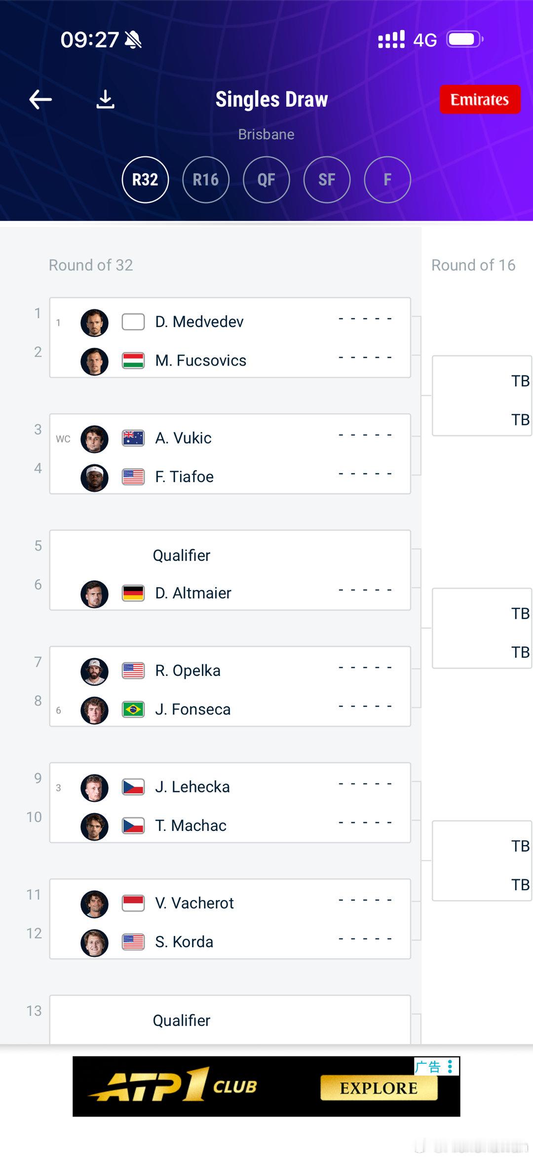ATP布里斯班250赛正赛签表出炉,梅德韦杰夫、弗基纳分列头两号种子,迪米特洛夫首轮对阵资格赛选手,克耶高斯持外卡复出首战面对克瓦塞维奇。网球talking大会体育大赏
