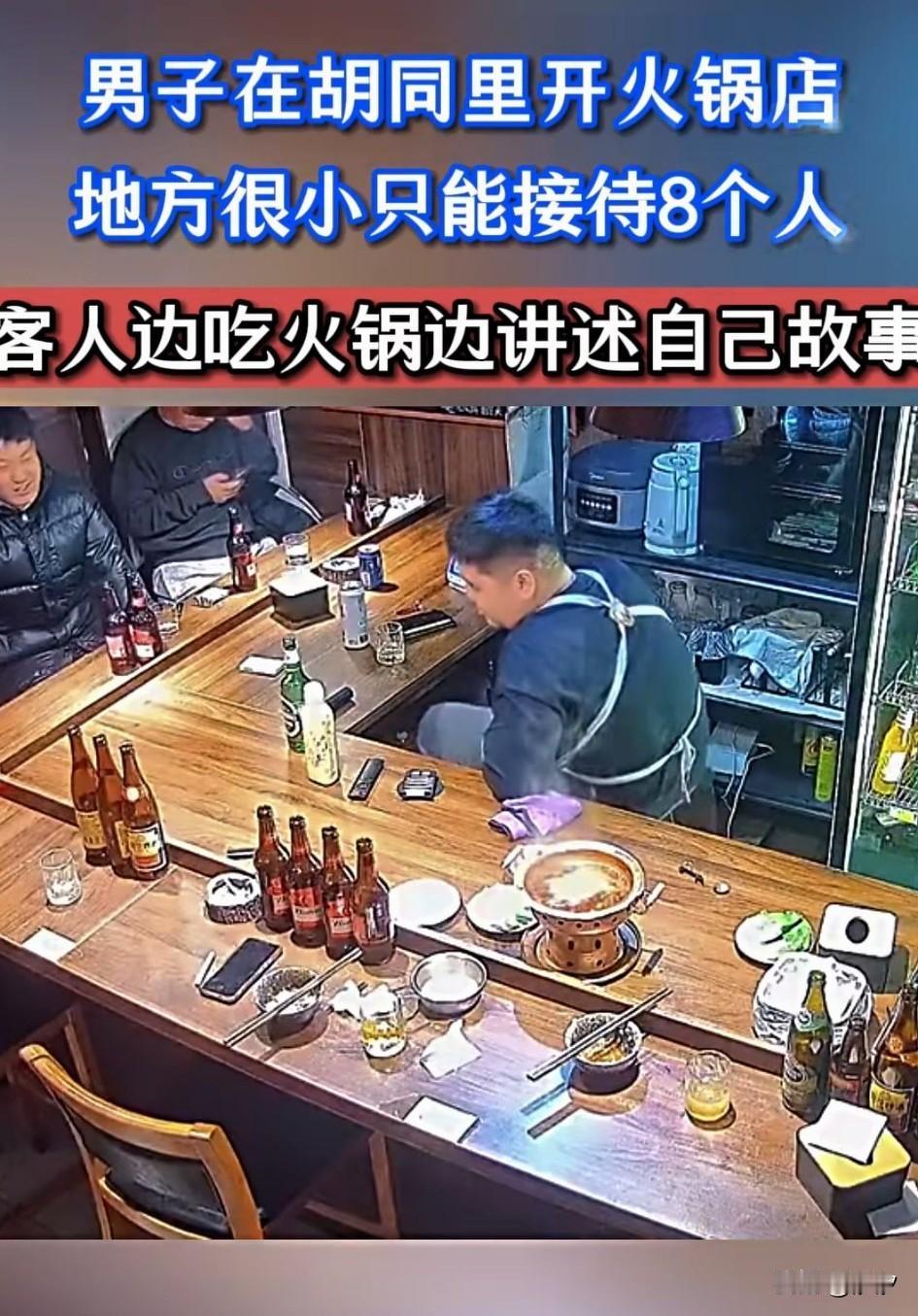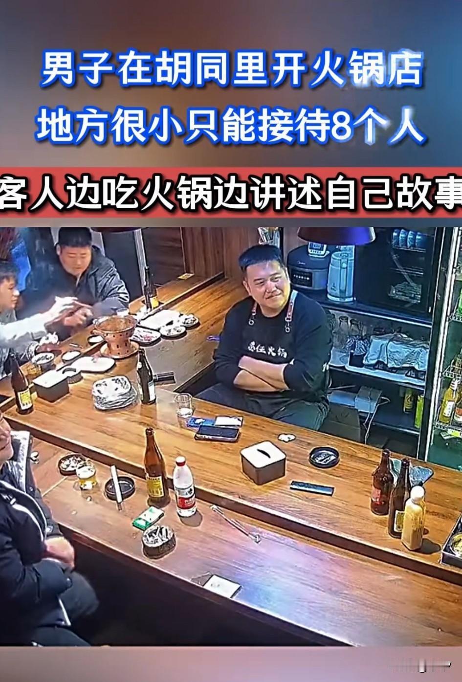 男子在一个胡同里面开了一家火锅店, 由于店铺面积有限, 只能接待8个人, 老板就坐在中间的位置, 这边都是吃饭的桌子, 看着非常的像私家小灶, 本来以为这是个劣势, 结果这却是一个优势, 食客和老板离得非常近, 老板服务他们也很方便, 他们还边吃边聊, 其他的时候也可以和周围的人交流, 因为大家做的都很近, 过来这里吃饭的都是大老爷们, 他们都是一边吃饭一边喝酒, 每个人都会在这里分享自己的故事, 因此这里的生意非常的好, 还真是无心插柳柳成荫, 老板也没想到自己的生意会这么好, 每天都可以交到很多新朋友, 这样的吃饭方式确实很新颖, 说不定以后这样的火锅店会爆火! 大家喜欢这样的火锅店吗? 餐饮店的那些事 火锅店 火锅店经营技巧 火锅店实测