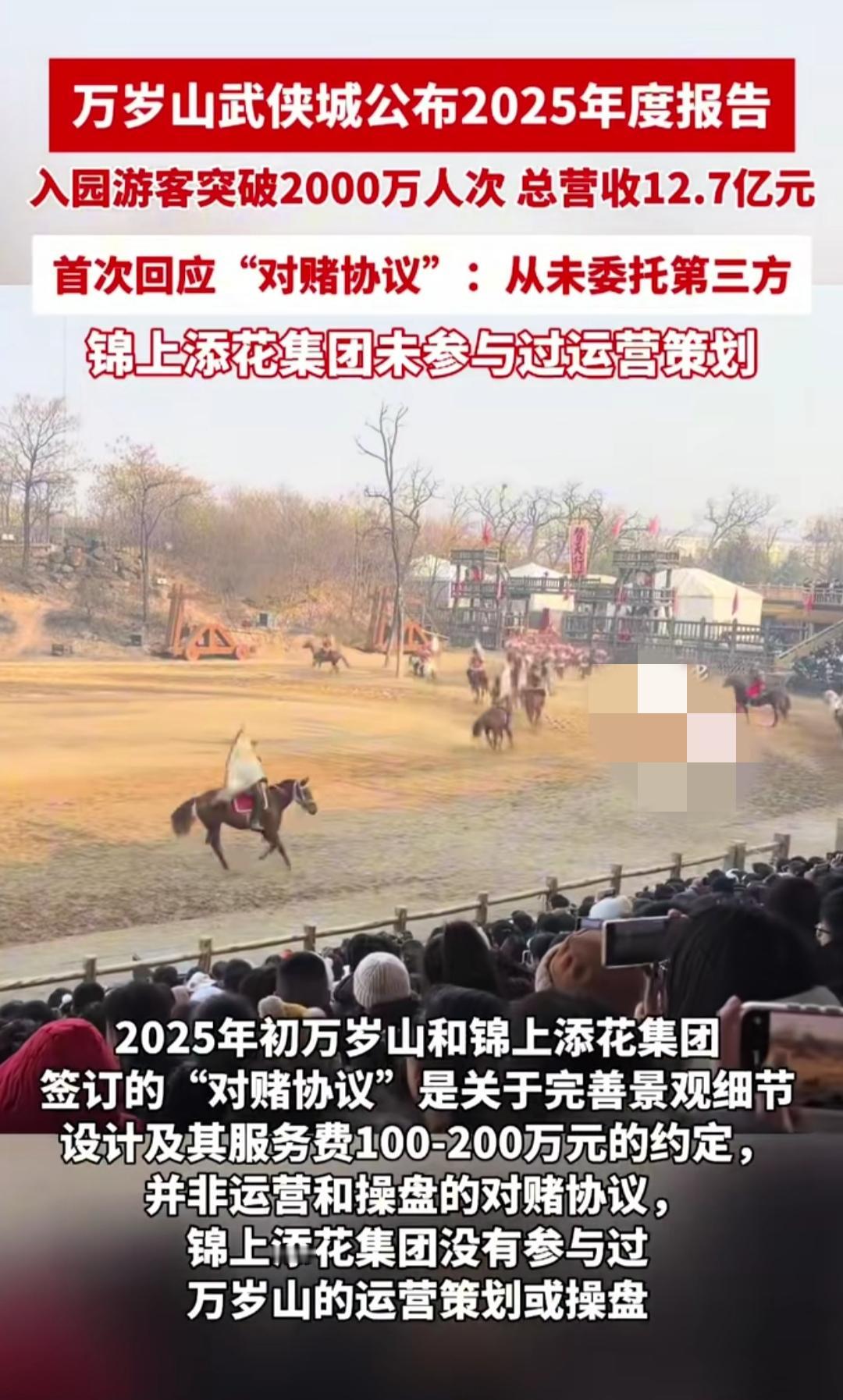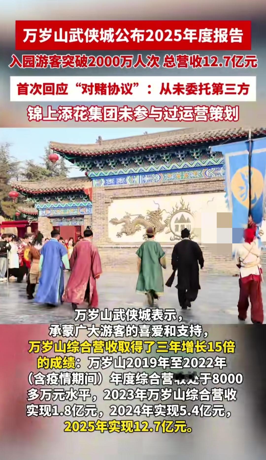 你敢信吗?一个曾在疫情期间年营收只有8000多万的景区,居然在2025年交出了12.7亿的成绩单,三年直接暴涨15倍!万岁山武侠城的逆袭,狠狠戳中了无数还在迷茫的文旅从业者的心。 2026年1月初,这份亮眼的营收数据一经公布,就引发全网热议。更让人关注的是,官方还首次正面回应了“对赌协议”争议,明确表示从未委托第三方运营,和相关公司的合作只是景观设计服务,和景区运营半毛钱关系没有。 从无人问津到一票难求,万岁山靠的从不是花哨的营销,而是实打实的沉浸式武侠体验。没有高价门票宰客,没有套路满满的二次消费,只靠让游客玩得尽兴,就攒下了好口碑。说到底,文旅行业的破局密码从来都很简单:真心换真心,才能走得长远。
