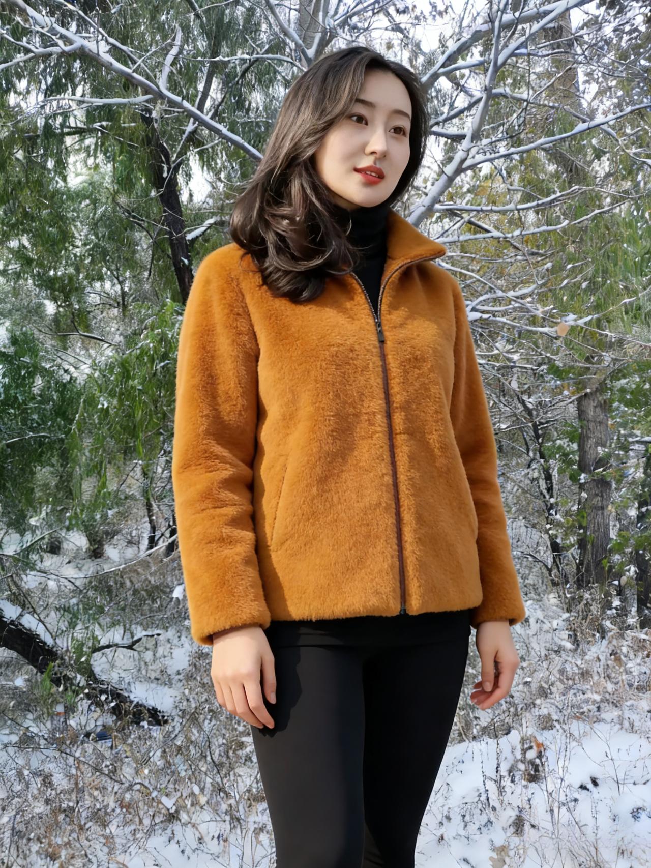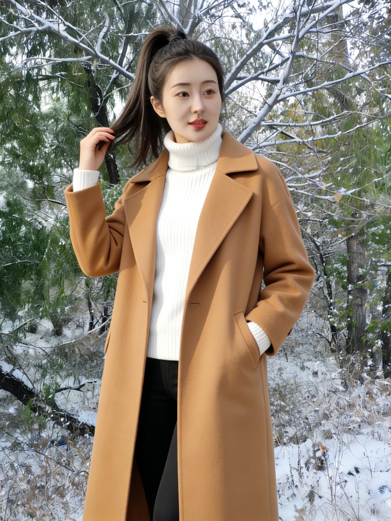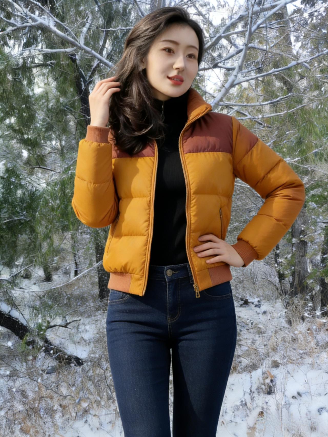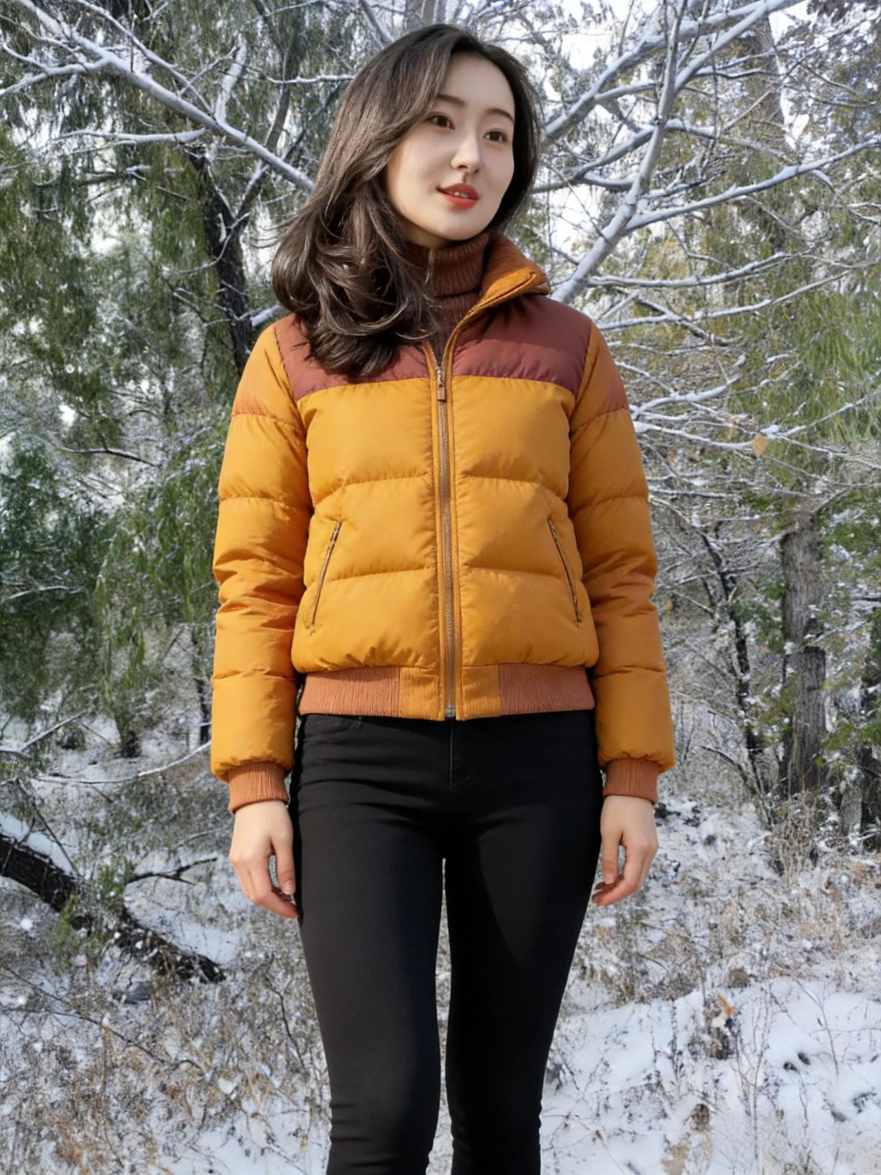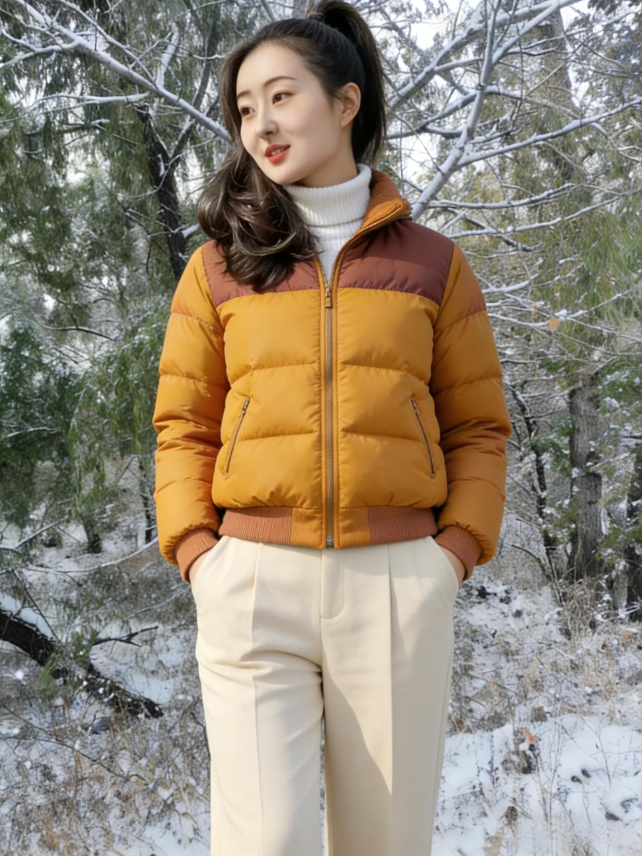 雪压松枝玉屑飘,短绒黄袄衬纤腰。 棕红拼色凝秋意,素白铺林雪满条。 鬓发轻沾琼蕊细,唇脂微映冷光娇。 林深路僻人踪少,野旷天低雁影遥。 衣软犹能遮朔气,心清不畏朔风飙。 何妨立尽寒林里,且赏冬光醉碧霄。