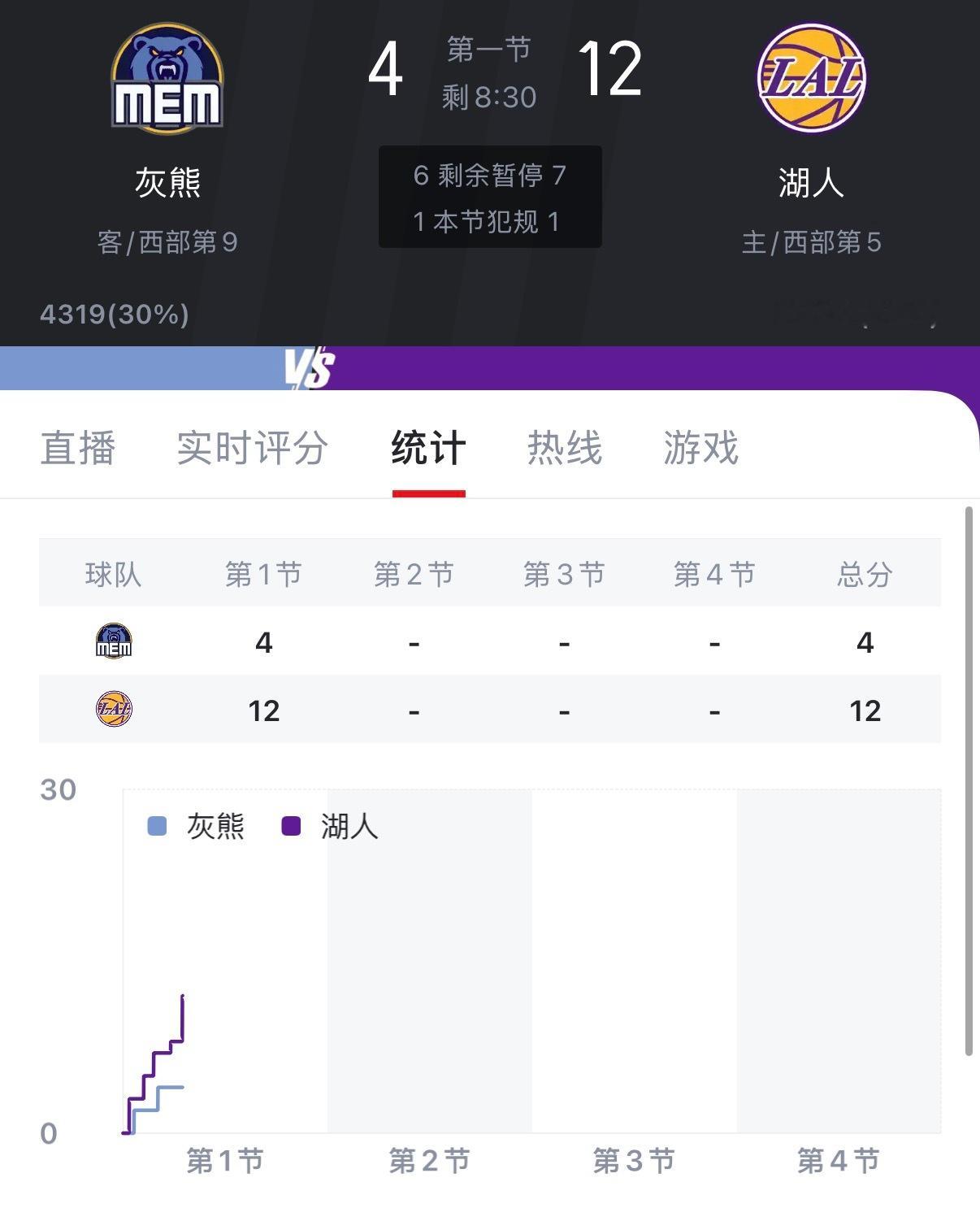 开局湖人12:4领先灰熊八分!今天开局斯玛特和拉拉维亚投进两记三分球,进攻空间明显好很多。灰熊vs湖人