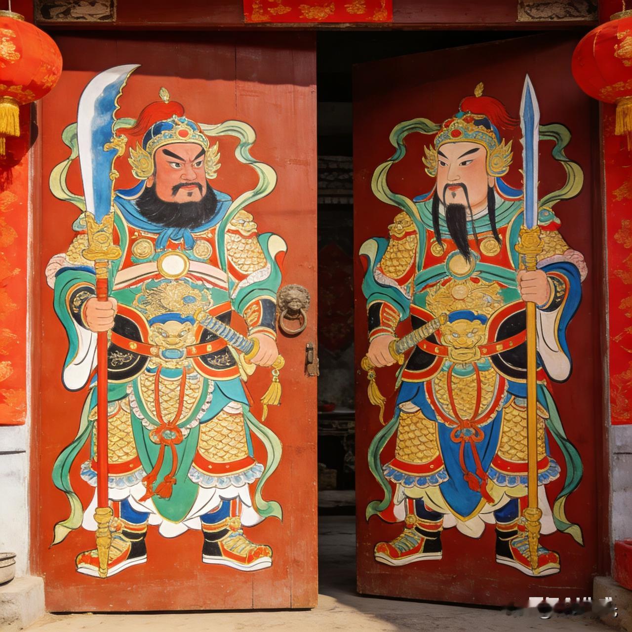 城里过年门上都贴福啊啥的,农村过年大门上要贴秦琼敬德的,大家都知道吧! 那是唐太宗登基后,常梦鬼魅扰宫,夜不能寐,秦琼、敬德自请夜守宫门,果然无事,太宗念二人辛劳,命画其像悬于宫门,宫中安宁,后传至民间 。 年三十,家家户户贴门神,这里面有个讲究,就是左右要贴对,秦琼白脸持双锏居左,尉迟恭黑脸持双鞭居右,两名武将所持武器要向外打,不能向里打,这样就可以镇宅驱邪、护佑家宅平安,而秦琼敬德是最经典的武将门神组合。