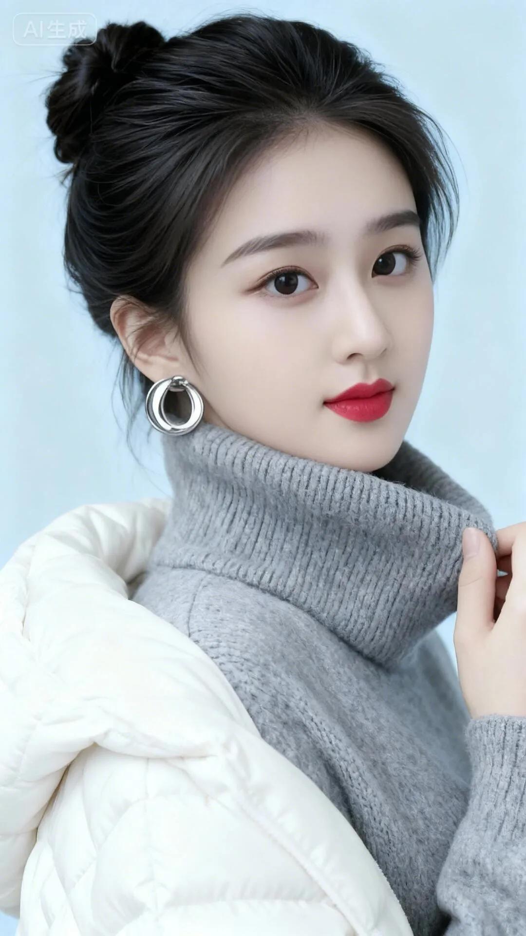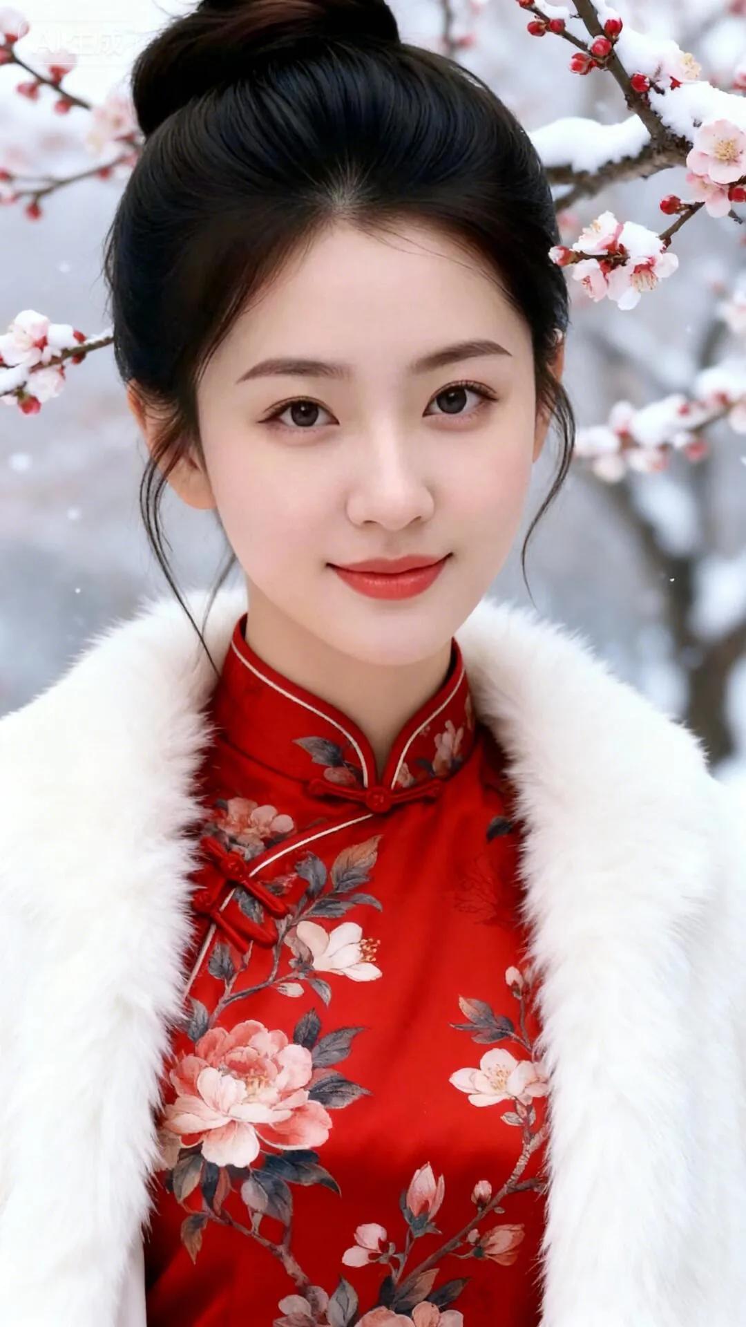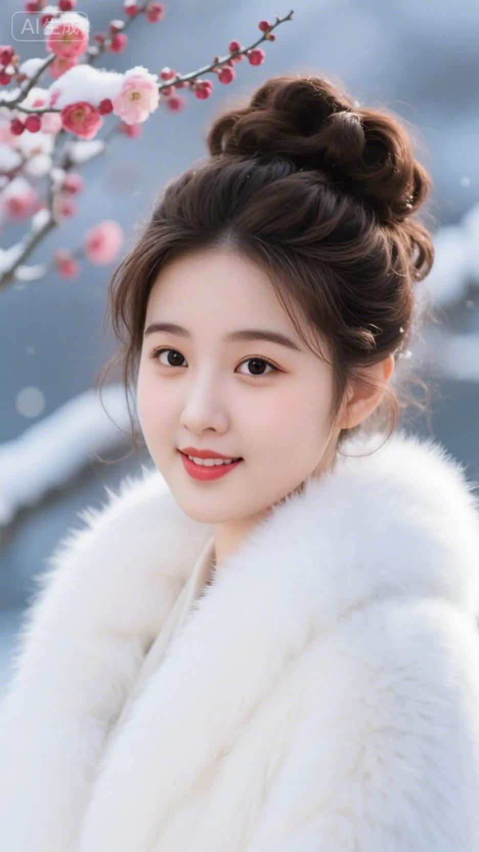 冬日暖阳下,红唇少女与雪景相映成趣。