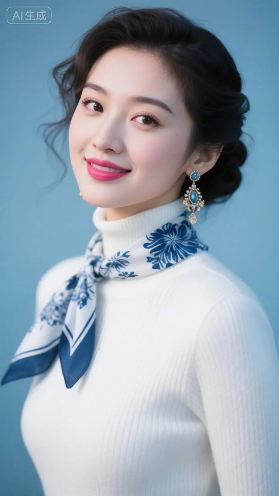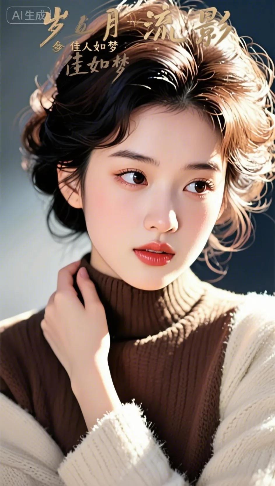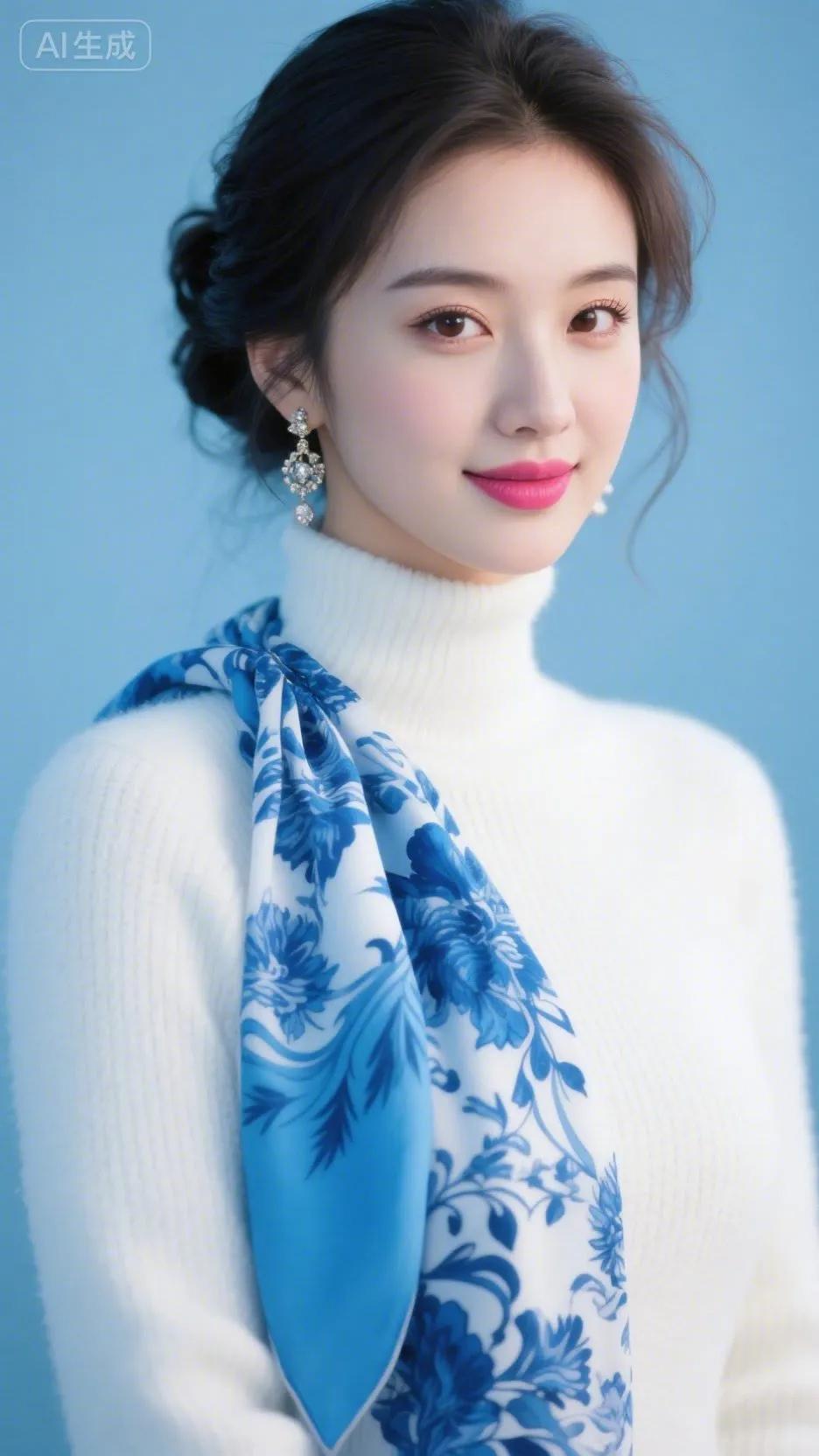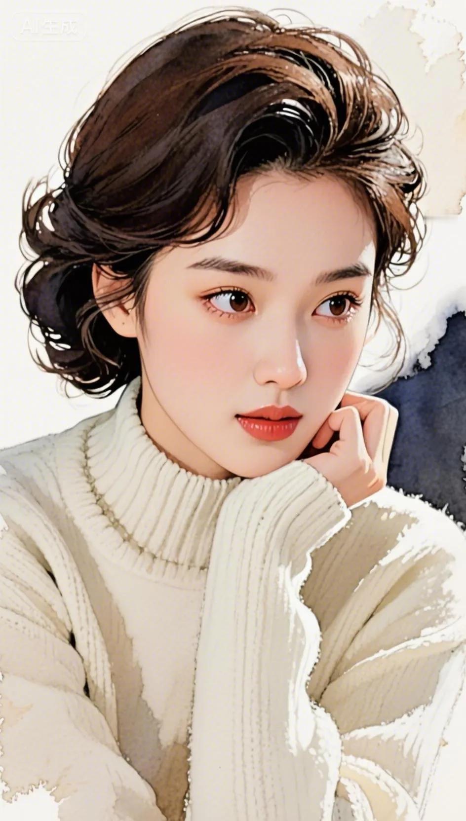冬日暖阳下,红唇少女与雪景相映成趣。
