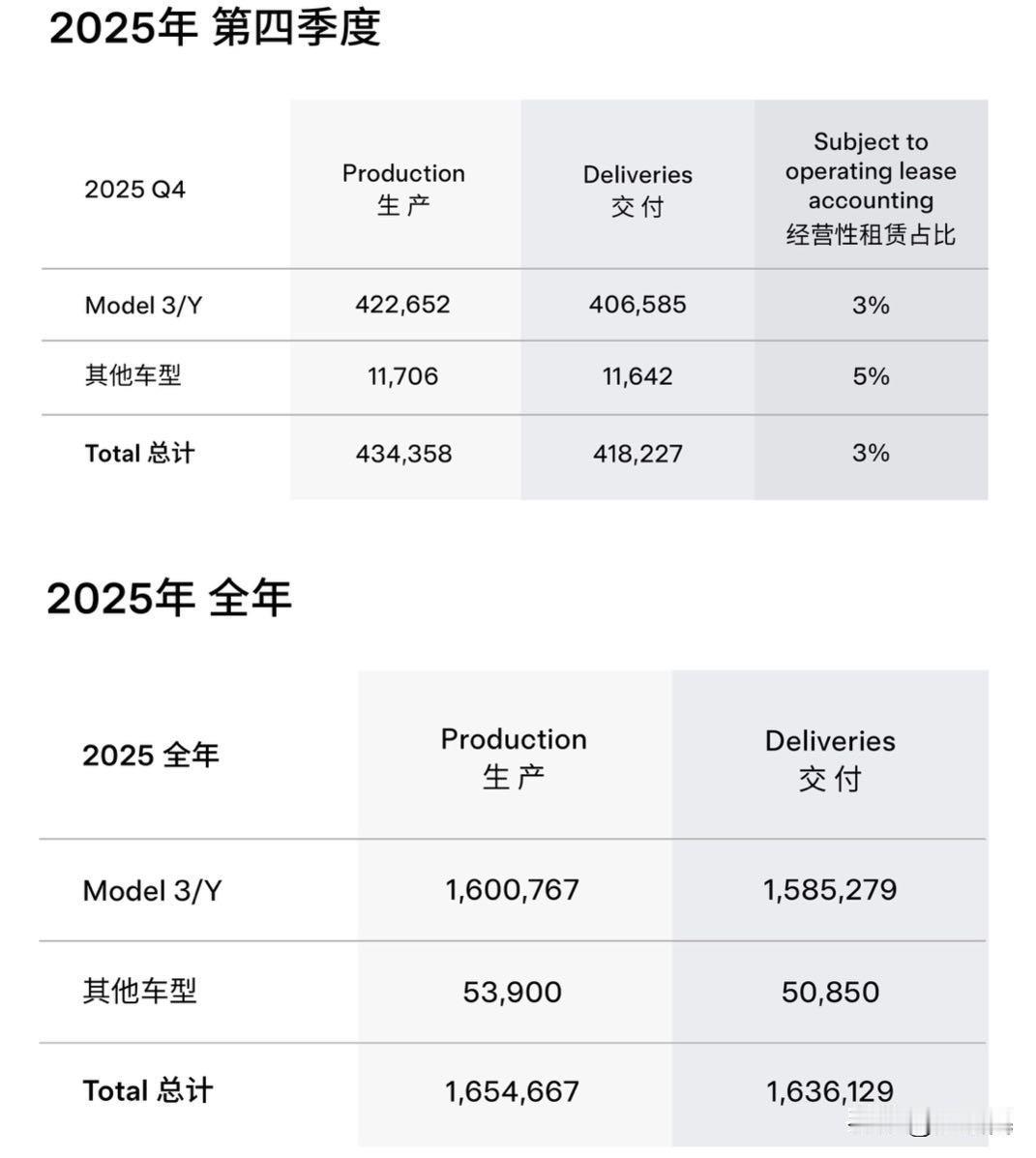 2026年1月2日,特斯拉发布2025年全球生产与交付报告。数据显示,特斯拉2025年全年全球范围内共计生产电动车约165.5万辆,交付约163.6万辆;储能产品全年装机量达46.7吉瓦时,同比增长48.7%。其中第四季度特斯拉全球生产电动车约43.4万辆,交付共41.8万辆;储能产品装机量达14.2吉瓦时,环比增长13%,创下季度装机量新纪录。 根据此前公司发布的数据,2025年特斯拉超级充电网络规模扩大了18%;Powerwall全球安装量突破百万;与美国道路平均值相比,特斯拉智能辅助驾驶已经将重大碰撞事故发生率降至1/8。2025年12月30日,特斯拉全球第900万辆电动车顺利在上海超级工厂下线。